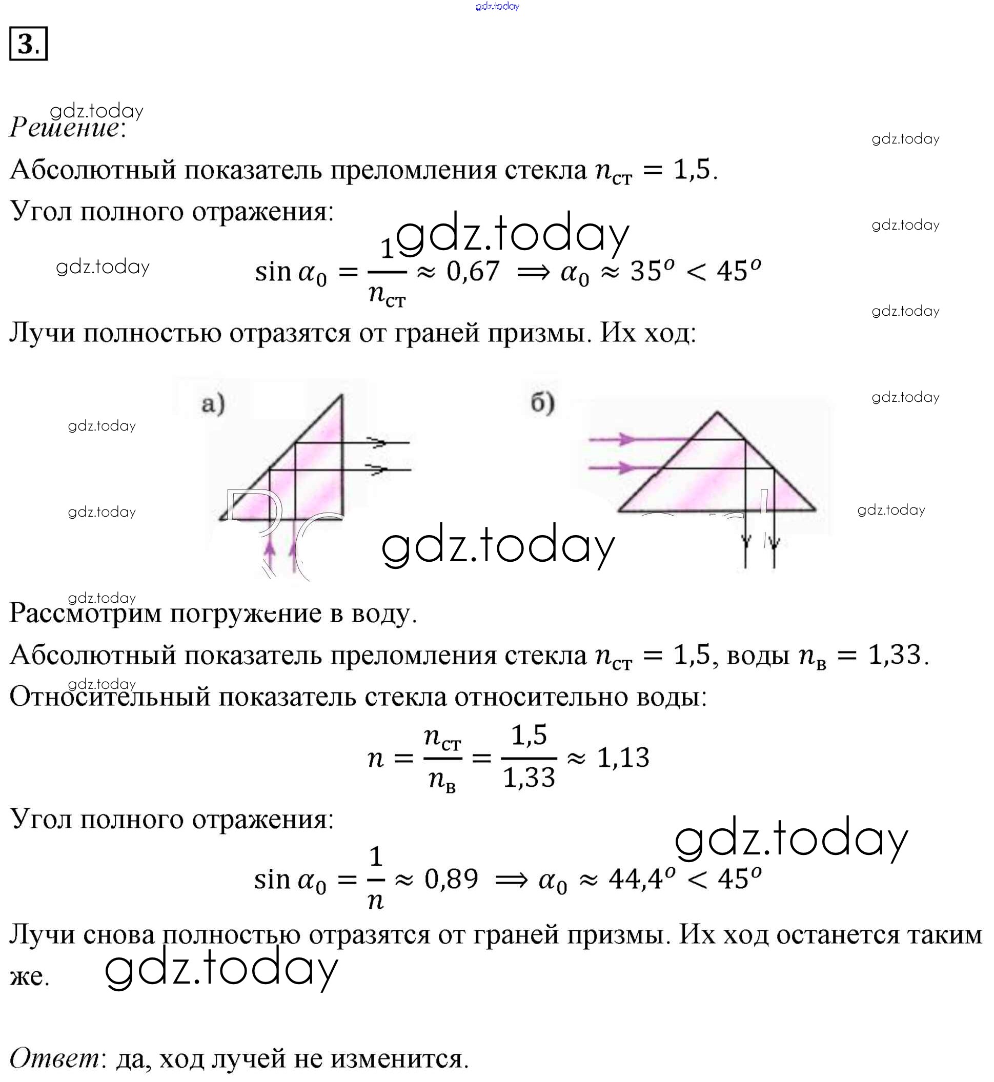 Ответы к Задачи для самостоятельного решения Решение к §49. Примеры решения задач по теме «Закон преломления света. Полное отражение света» 3 Учебнику по Физике для 11 класса Мякишев, Буховцев Базовый уровень Просвещение 2018