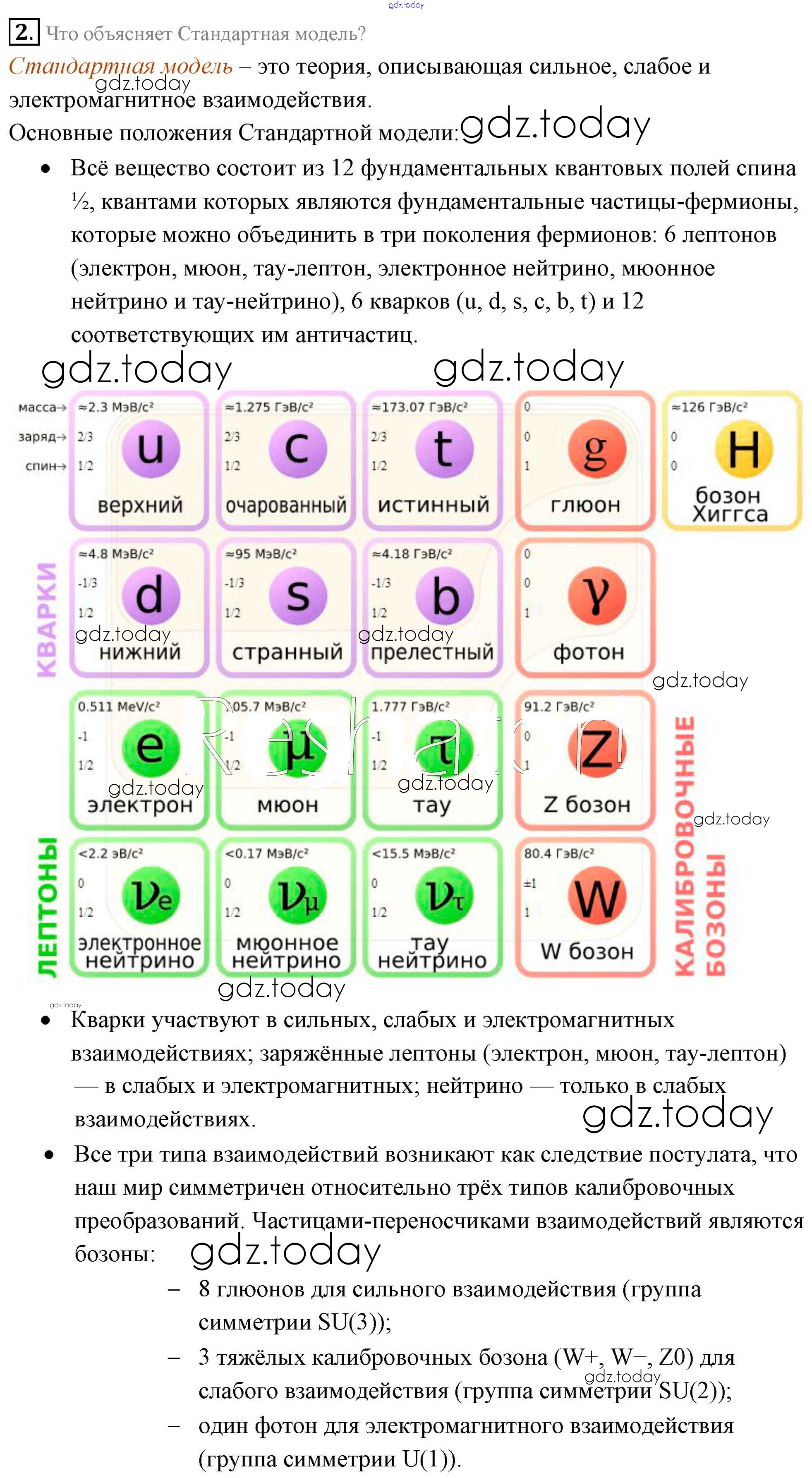 На страницах сайта gdz.today вы найдете учебный и вспомогательный материал, направленный на улучшения знаний школьной программы. ГДЗ - онлайн мир знаний Вопросы к параграфу Решение к §98. Адроны. Кварки 2 Учебнику по Физике для 11 класса Мякишев, Буховцев Базовый уровень Просвещение 2018