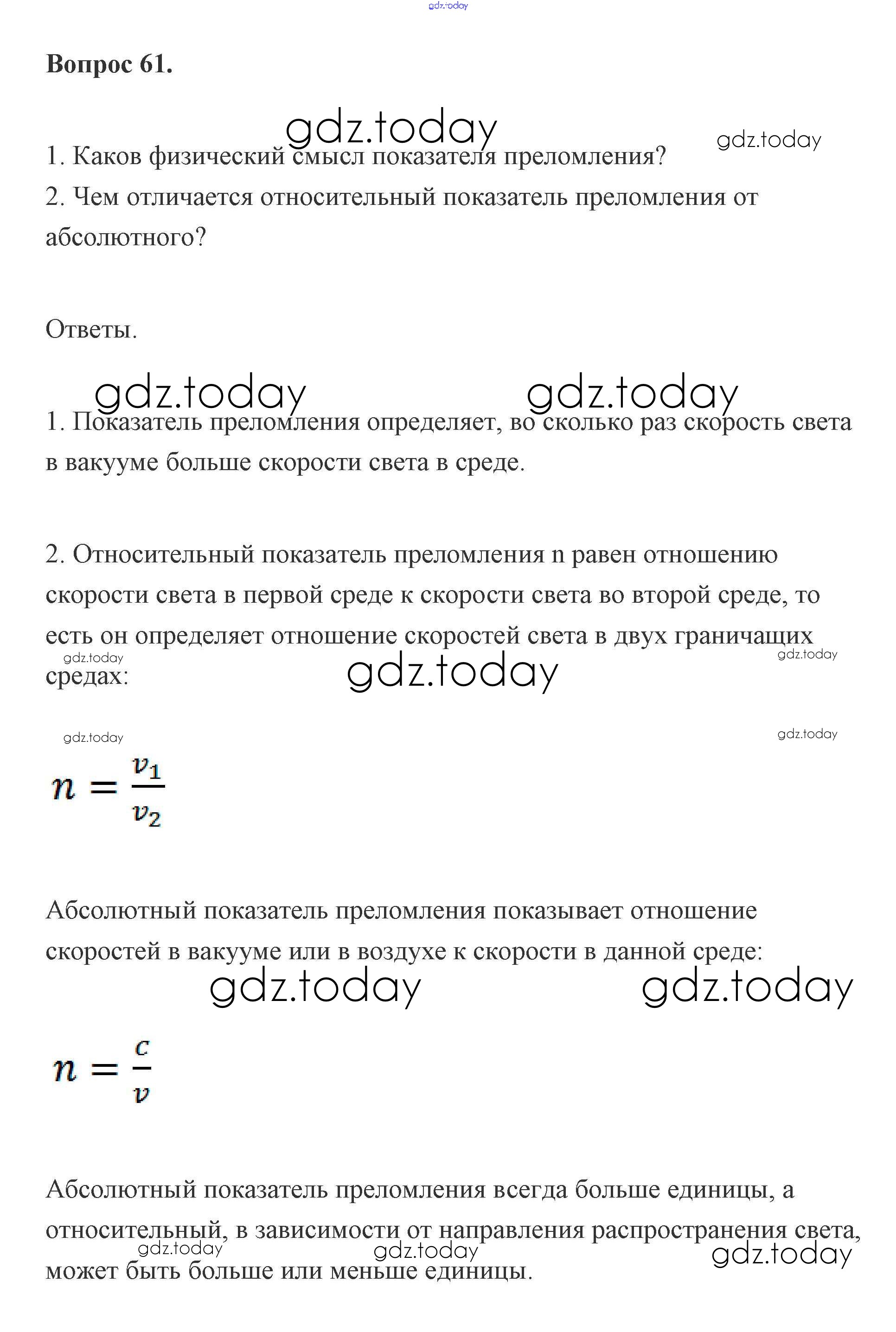 На страницах сайта gdz.today вы найдете учебный и вспомогательный материал, направленный на улучшения знаний школьной программы. ГДЗ - онлайн мир знаний Решение к вопросам 61 Учебнику по Физике для 11 класса Мякишев, Буховцев Базовый и углубленный уровень Просвещение 2019