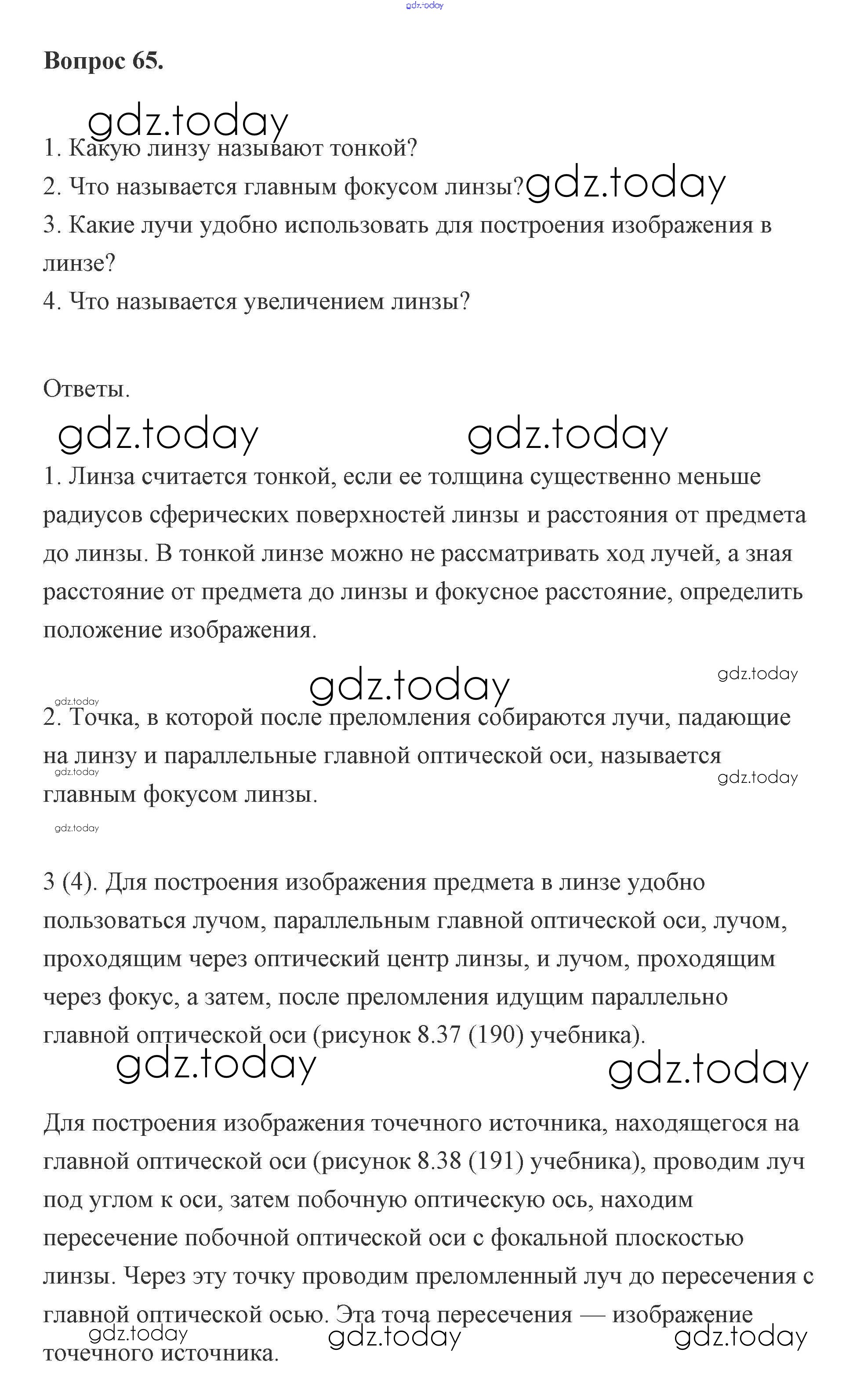 На страницах сайта gdz.today вы найдете учебный и вспомогательный материал, направленный на улучшения знаний школьной программы. ГДЗ - онлайн мир знаний Решение к вопросам 65 Учебнику по Физике для 11 класса Мякишев, Буховцев Базовый и углубленный уровень Просвещение 2019