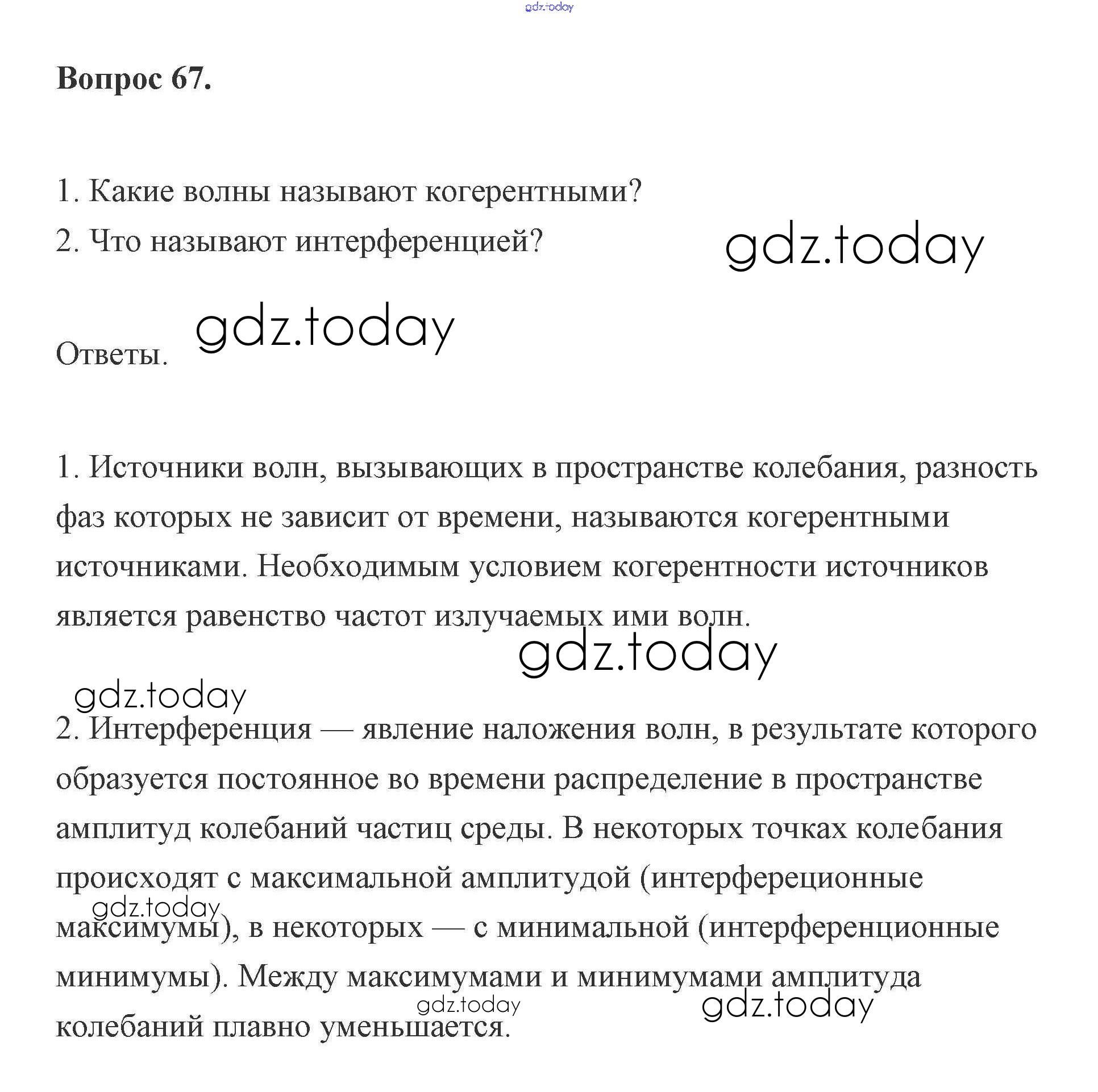 На страницах сайта gdz.today вы найдете учебный и вспомогательный материал, направленный на улучшения знаний школьной программы. ГДЗ - онлайн мир знаний Решение к вопросам 67 Учебнику по Физике для 11 класса Мякишев, Буховцев Базовый и углубленный уровень Просвещение 2019