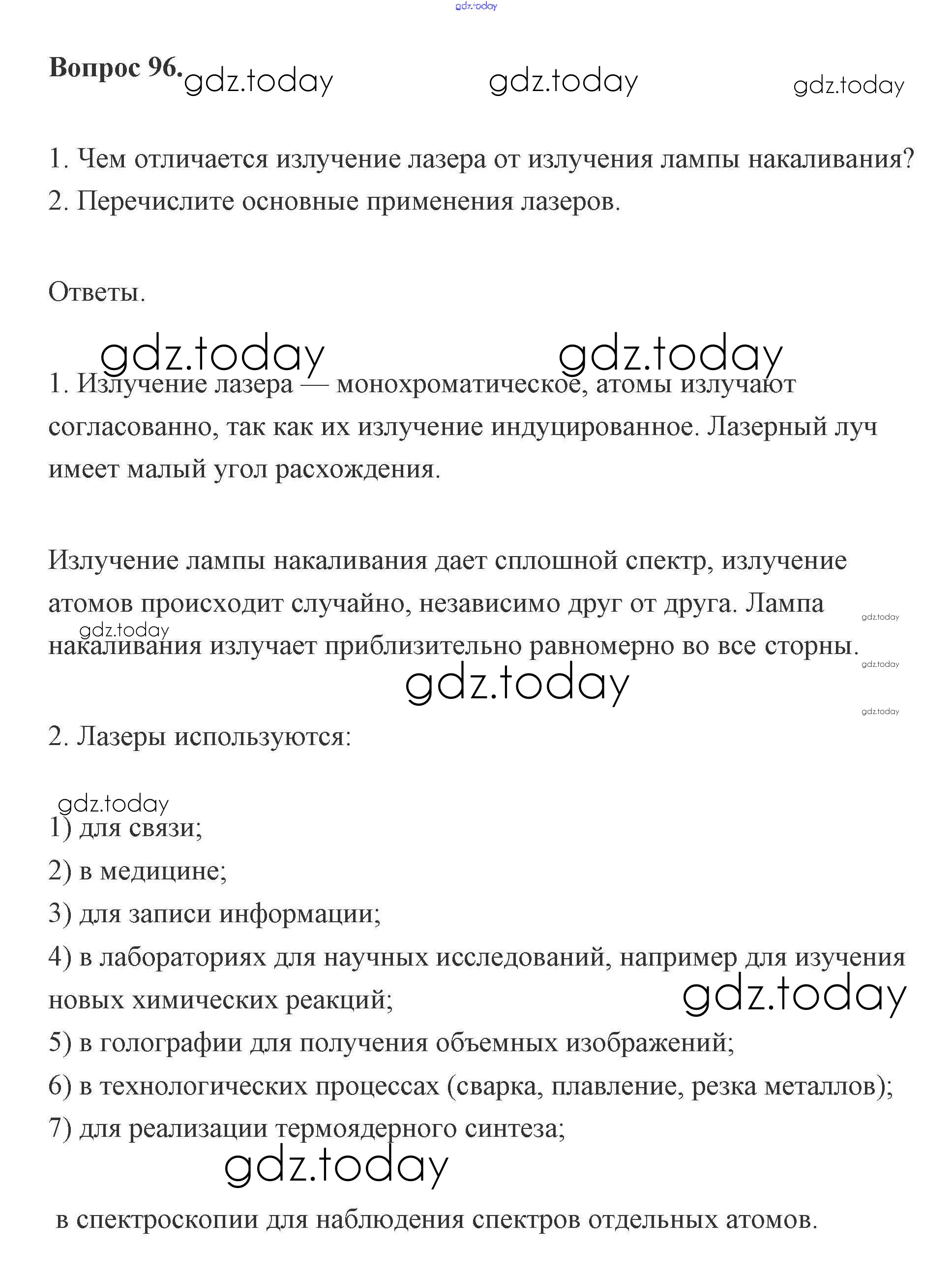 На страницах сайта gdz.today вы найдете учебный и вспомогательный материал, направленный на улучшения знаний школьной программы. ГДЗ - онлайн мир знаний Решение к вопросам 96 Учебнику по Физике для 11 класса Мякишев, Буховцев Базовый и углубленный уровень Просвещение 2019
