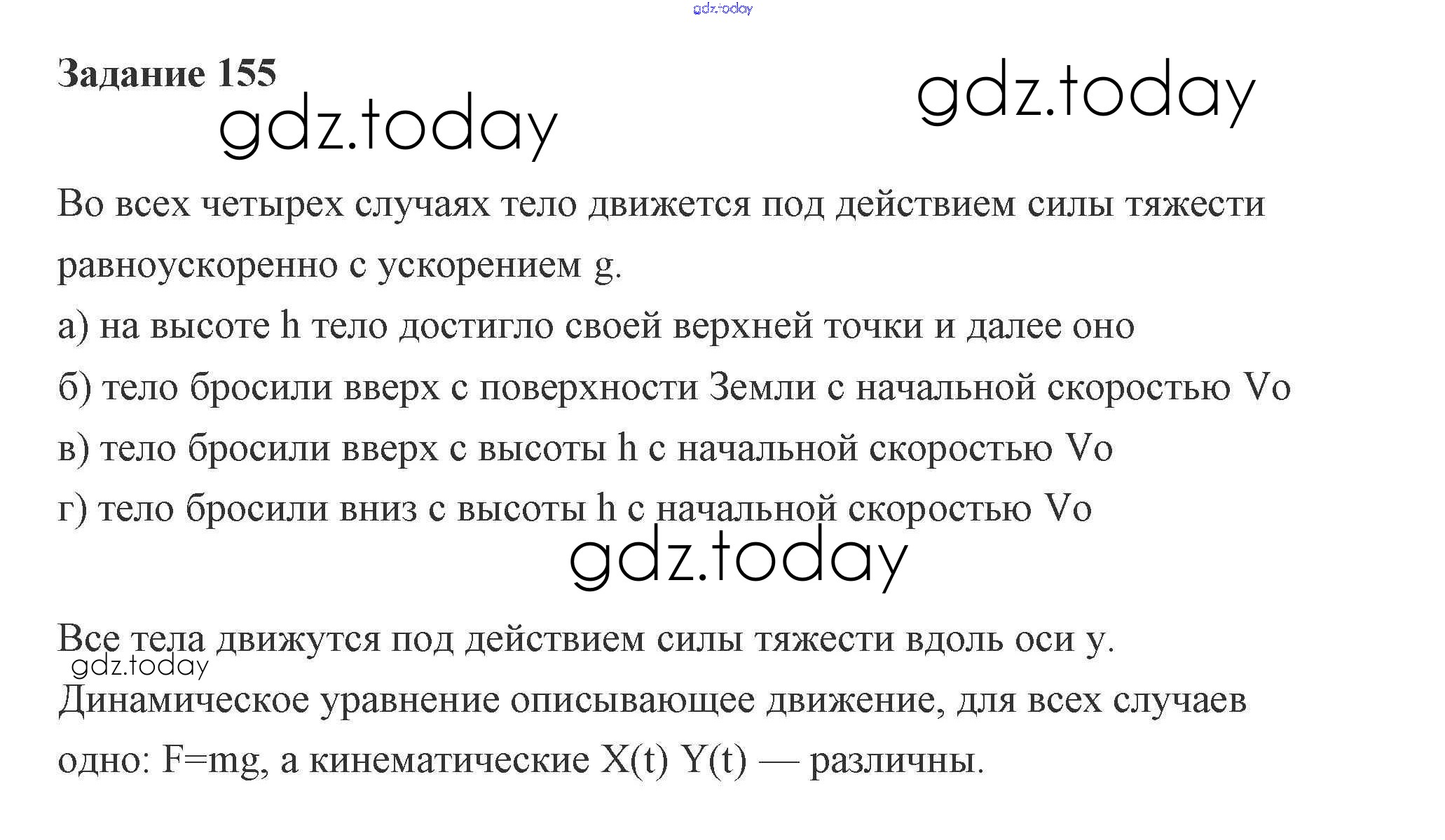 На страницах сайта gdz.today вы найдете учебный и вспомогательный материал, направленный на улучшения знаний школьной программы. ГДЗ - онлайн мир знаний 9. Движение тела под действием силы тяжести. Прямолинейное движение по вертикали Решение к теме "Основы динамики" 155 Сборнику задач по Физике для 10-11 класса Степанова Просвещение 2015