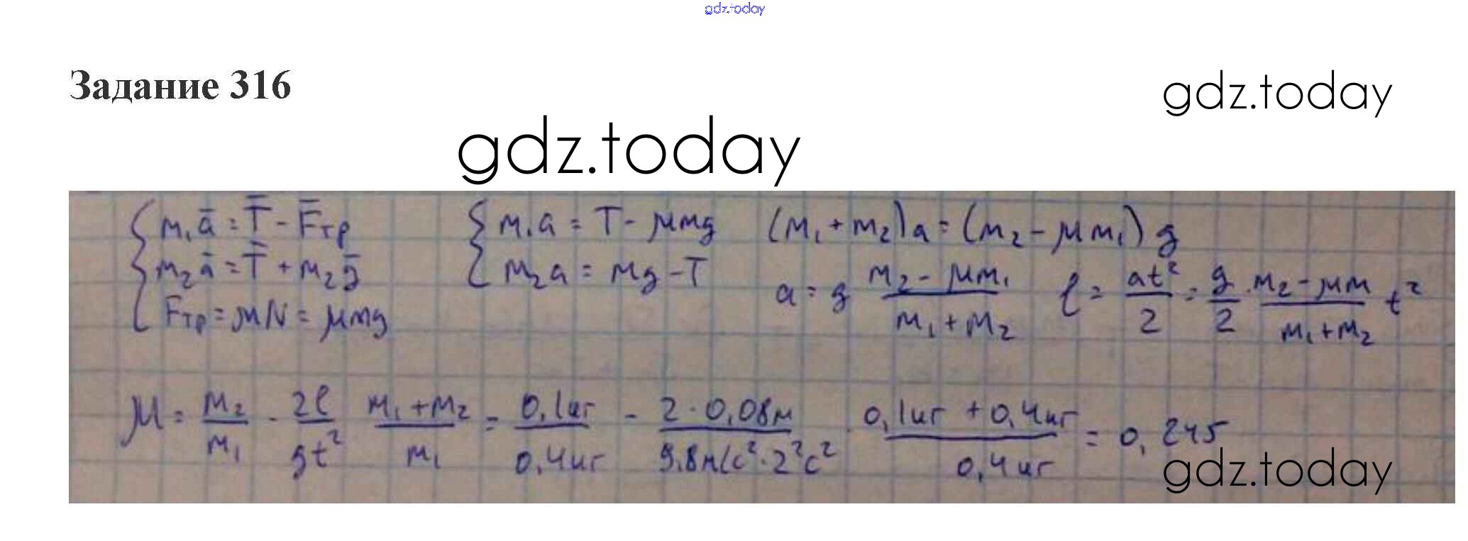 На страницах сайта gdz.today вы найдете учебный и вспомогательный материал, направленный на улучшения знаний школьной программы. ГДЗ - онлайн мир знаний Движение связанных тел Решение к теме "Основы динамики" 316 Сборнику задач по Физике для 10-11 класса Степанова Просвещение 2015