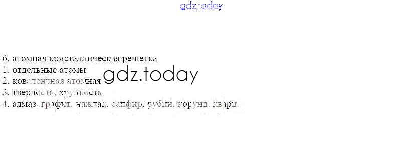 На страницах сайта gdz.today вы найдете учебный и вспомогательный материал, направленный на улучшения знаний школьной программы. ГДЗ - онлайн мир знаний Решение к теме: Ковалентная связь. Атомная и молекулярная кристаллические решеткисвязь. Ионная кристаллическая решетка 6 Рабочей тетради по Химии для 11 класса Габриелян, Яшукова Базовый уровень Дрофа 2014
