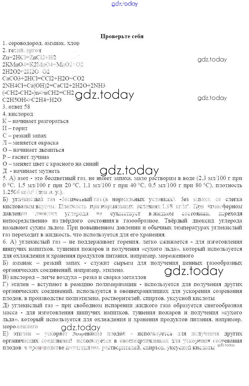 На страницах сайта gdz.today вы найдете учебный и вспомогательный материал, направленный на улучшения знаний школьной программы. ГДЗ - онлайн мир знаний Решение к теме: Представители газов (водород, кислород, углекислый газ, аммиак, этилен) Проверьте себя Рабочей тетради по Химии для 11 класса Габриелян, Яшукова Базовый уровень Дрофа 2014