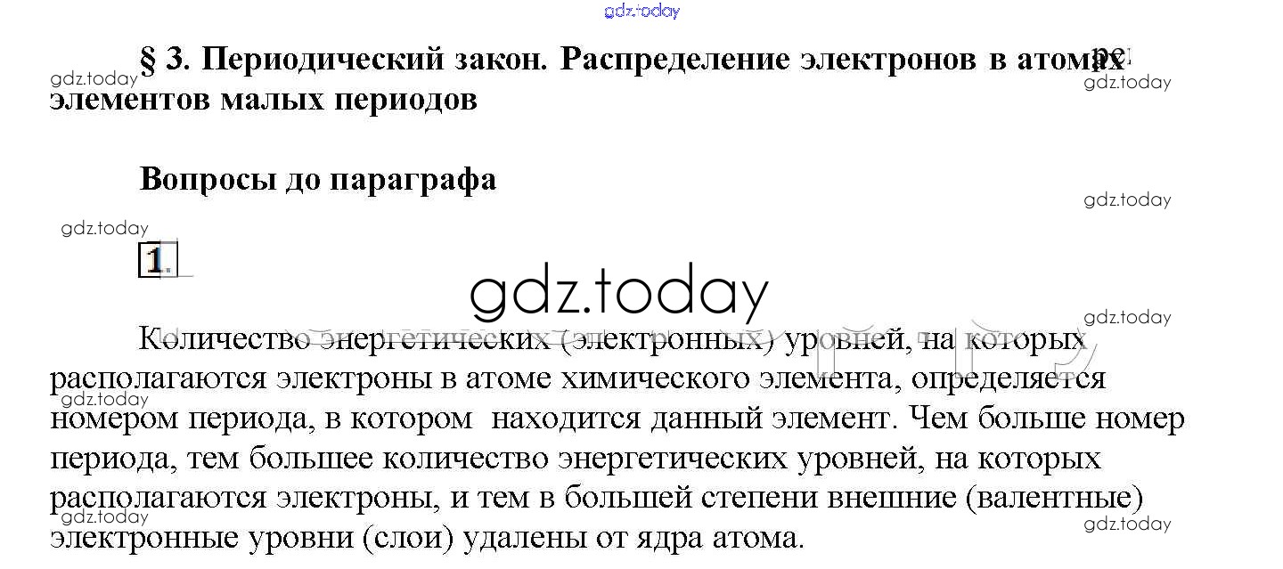 На страницах сайта gdz.today вы найдете учебный и вспомогательный материал, направленный на улучшения знаний школьной программы. ГДЗ - онлайн мир знаний Вопросы до параграфа Решение к § 3. Периодический закон. Распределение электронов в атомах элементов малых периодов 1 Учебнику по Химии для 11 класса Рудзитис, Фельдман Базовый уровень Просвещение 2017