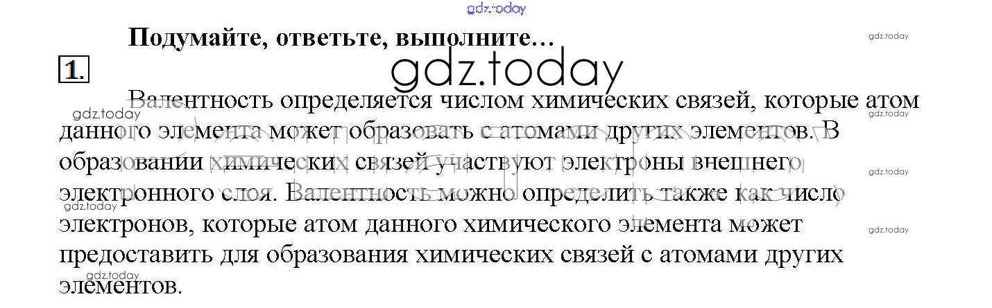 На страницах сайта gdz.today вы найдете учебный и вспомогательный материал, направленный на улучшения знаний школьной программы. ГДЗ - онлайн мир знаний Подумайте, ответьте, выполните Решение к § 6. Валентность и валентные возможности атомов 1 Учебнику по Химии для 11 класса Рудзитис, Фельдман Базовый уровень Просвещение 2017
