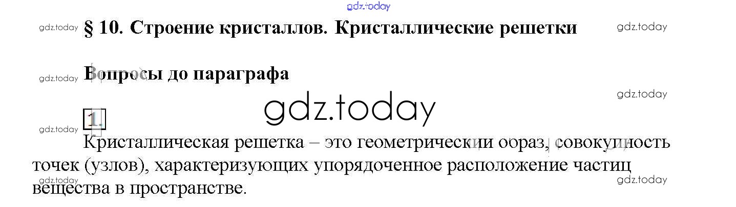 На страницах сайта gdz.today вы найдете учебный и вспомогательный материал, направленный на улучшения знаний школьной программы. ГДЗ - онлайн мир знаний Вопросы до параграфа Решение к § 10. Строение кристаллов. кристаллические решётки 1 Учебнику по Химии для 11 класса Рудзитис, Фельдман Базовый уровень Просвещение 2017