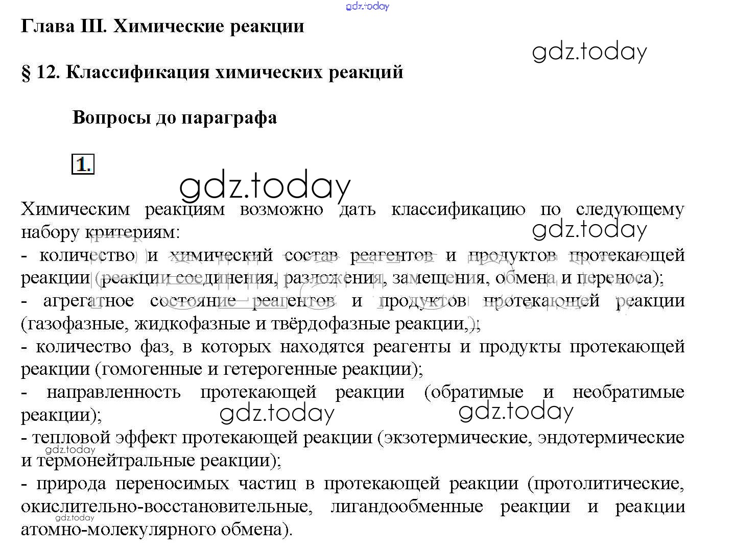 На страницах сайта gdz.today вы найдете учебный и вспомогательный материал, направленный на улучшения знаний школьной программы. ГДЗ - онлайн мир знаний Вопросы до параграфа Решение к § 12. Классификация химических реакций 1 Учебнику по Химии для 11 класса Рудзитис, Фельдман Базовый уровень Просвещение 2017
