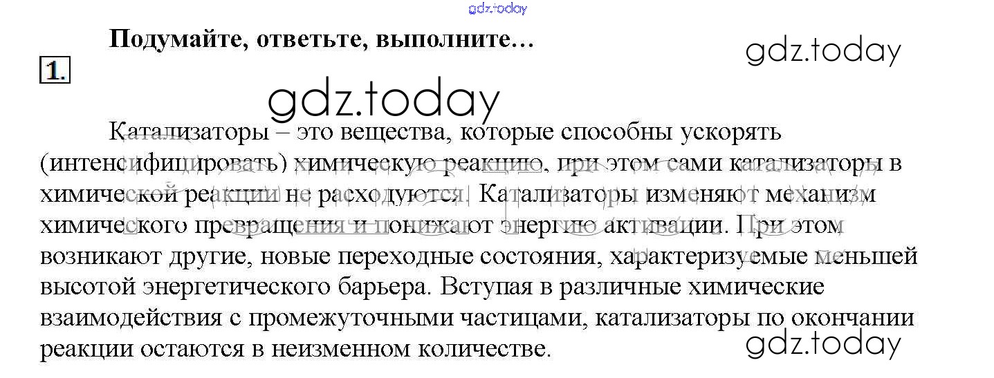 На страницах сайта gdz.today вы найдете учебный и вспомогательный материал, направленный на улучшения знаний школьной программы. ГДЗ - онлайн мир знаний Подумайте, ответьте, выполните Решение к § 14. Катализ 1 Учебнику по Химии для 11 класса Рудзитис, Фельдман Базовый уровень Просвещение 2017