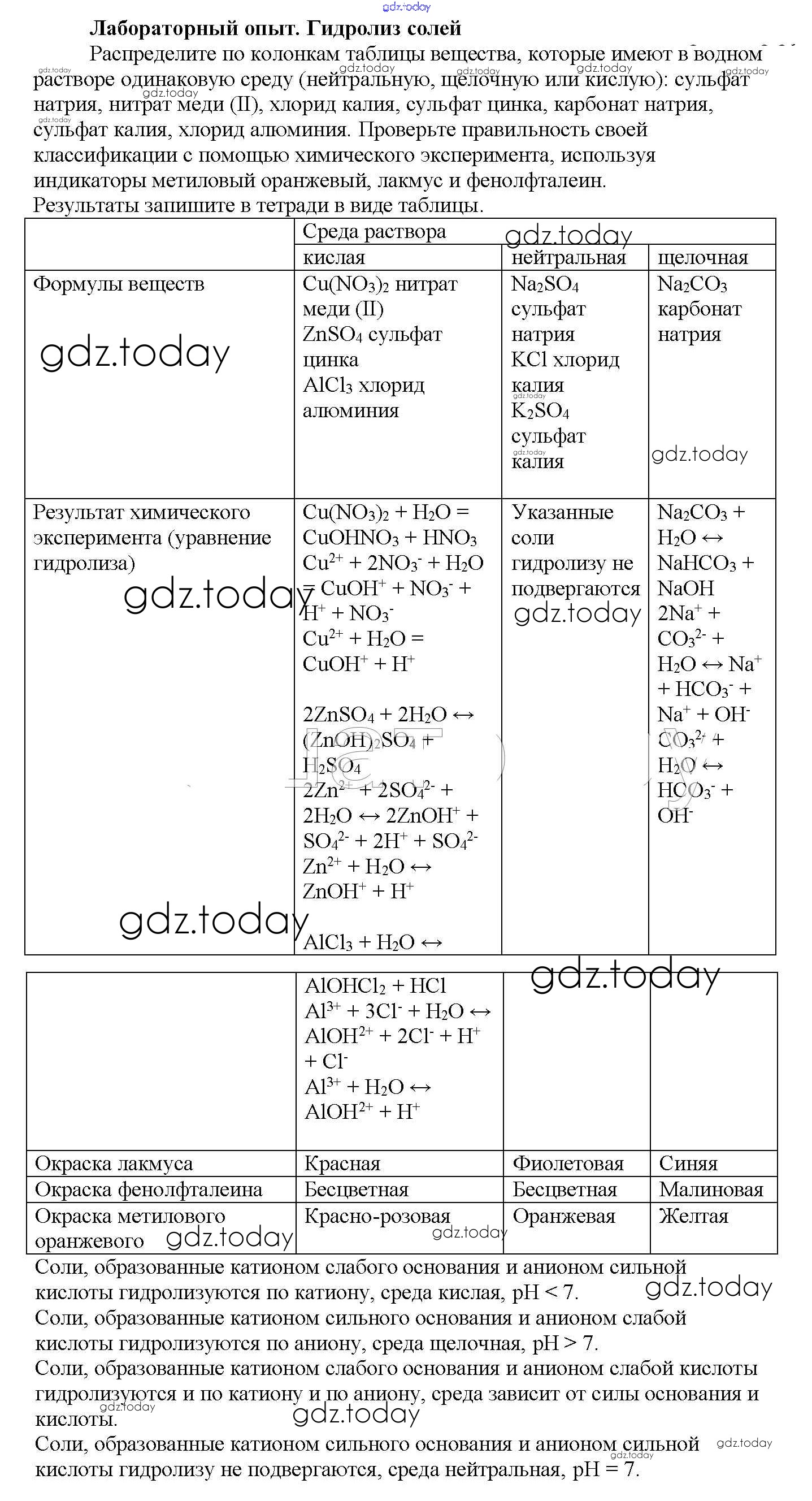На страницах сайта gdz.today вы найдете учебный и вспомогательный материал, направленный на улучшения знаний школьной программы. ГДЗ - онлайн мир знаний Лабораторный опыт. Гидролиз солей Решение к § 21. Гидролиз органических и неорганических соединений 1 Учебнику по Химии для 11 класса Рудзитис, Фельдман Базовый уровень Просвещение 2017