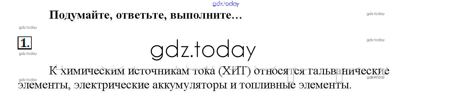 На страницах сайта gdz.today вы найдете учебный и вспомогательный материал, направленный на улучшения знаний школьной программы. ГДЗ - онлайн мир знаний Подумайте, ответьте, выполните Решение к § 22. Химические источники тока 1 Учебнику по Химии для 11 класса Рудзитис, Фельдман Базовый уровень Просвещение 2017