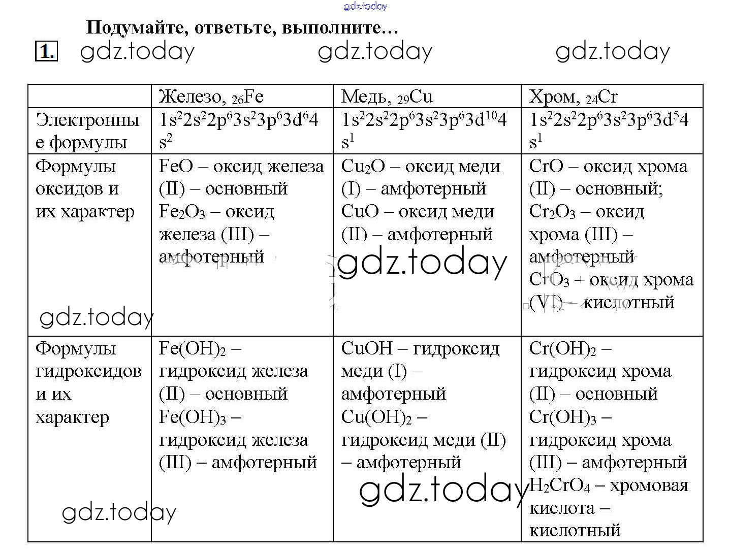 На страницах сайта gdz.today вы найдете учебный и вспомогательный материал, направленный на улучшения знаний школьной программы. ГДЗ - онлайн мир знаний Подумайте, ответьте, выполните Решение к § 28. Общий обзор металлических элементов б-групп 1 Учебнику по Химии для 11 класса Рудзитис, Фельдман Базовый уровень Просвещение 2017