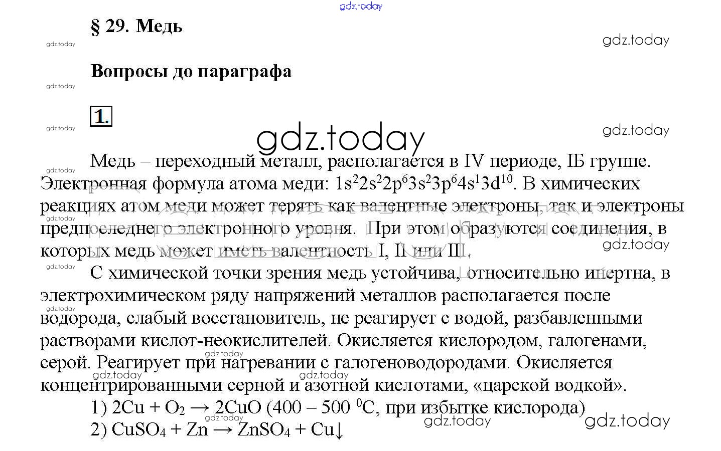 На страницах сайта gdz.today вы найдете учебный и вспомогательный материал, направленный на улучшения знаний школьной программы. ГДЗ - онлайн мир знаний Вопросы до параграфа Решение к § 29. Медь 1 Учебнику по Химии для 11 класса Рудзитис, Фельдман Базовый уровень Просвещение 2017