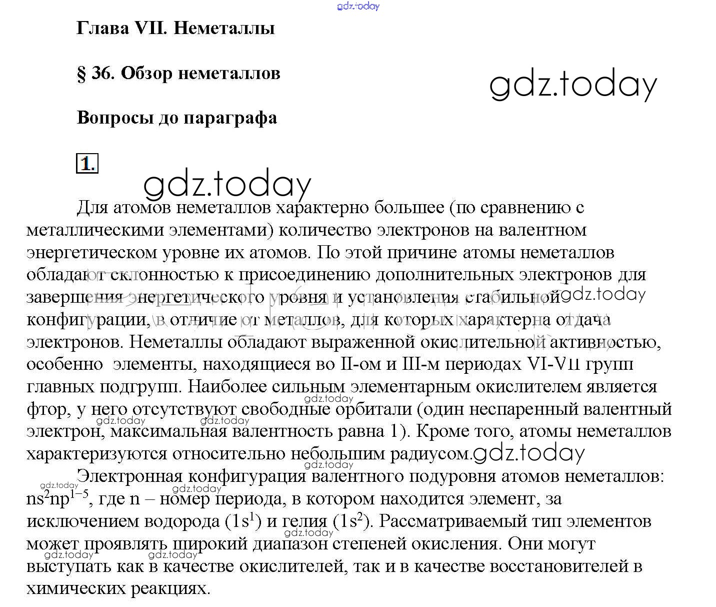 На страницах сайта gdz.today вы найдете учебный и вспомогательный материал, направленный на улучшения знаний школьной программы. ГДЗ - онлайн мир знаний Вопросы до параграфа Решение к § 36. Обзор неметаллов 1 Учебнику по Химии для 11 класса Рудзитис, Фельдман Базовый уровень Просвещение 2017