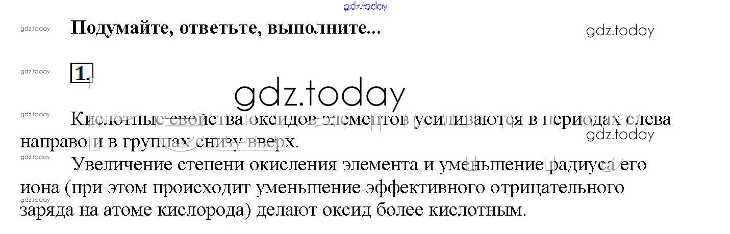На страницах сайта gdz.today вы найдете учебный и вспомогательный материал, направленный на улучшения знаний школьной программы. ГДЗ - онлайн мир знаний Подумайте, ответьте, выполните Решение к § 38. Общая характеристика оксидов неметаллов и кислородсодержащих кислот 1 Учебнику по Химии для 11 класса Рудзитис, Фельдман Базовый уровень Просвещение 2017