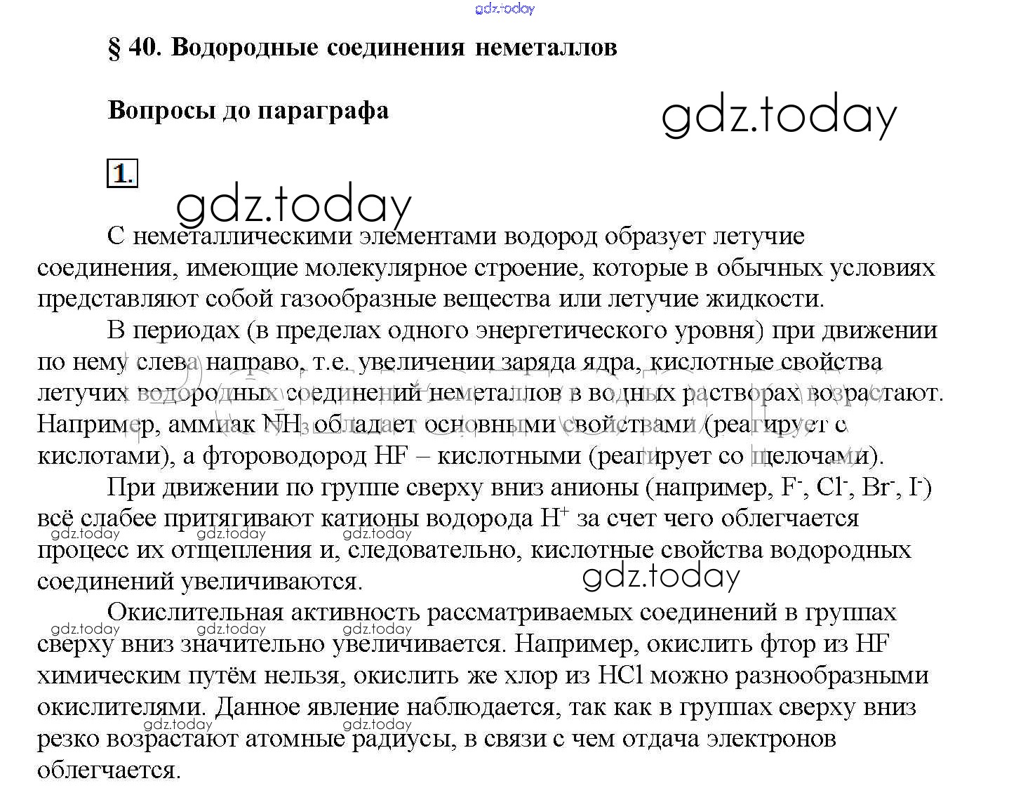 На страницах сайта gdz.today вы найдете учебный и вспомогательный материал, направленный на улучшения знаний школьной программы. ГДЗ - онлайн мир знаний Вопросы до параграфа Решение к § 40. Водородные соединения неметаллов 1 Учебнику по Химии для 11 класса Рудзитис, Фельдман Базовый уровень Просвещение 2017