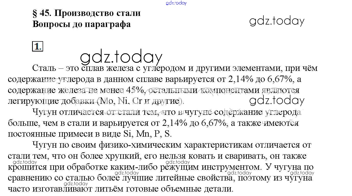 На страницах сайта gdz.today вы найдете учебный и вспомогательный материал, направленный на улучшения знаний школьной программы. ГДЗ - онлайн мир знаний Вопросы до параграфа Решение к § 45. Производство стали 1 Учебнику по Химии для 11 класса Рудзитис, Фельдман Базовый уровень Просвещение 2017
