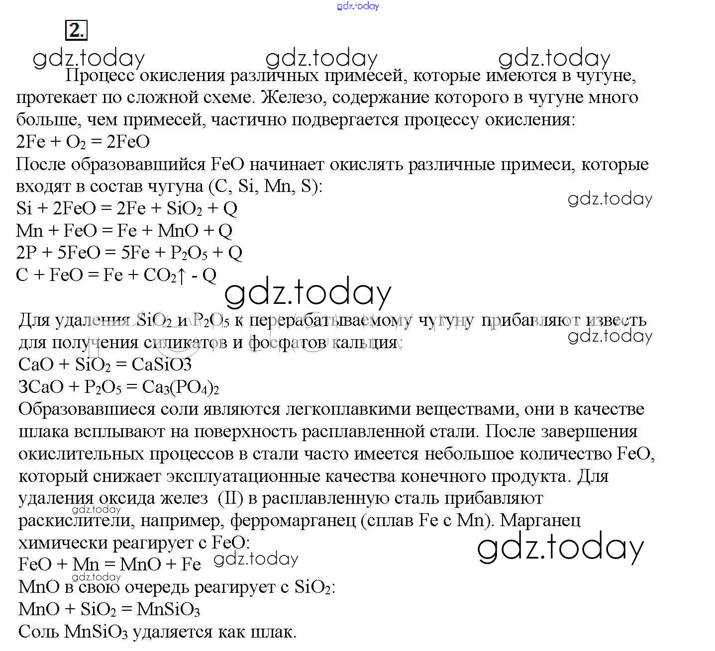 На страницах сайта gdz.today вы найдете учебный и вспомогательный материал, направленный на улучшения знаний школьной программы. ГДЗ - онлайн мир знаний Подумайте, ответьте, выполните Решение к § 45. Производство стали 2 Учебнику по Химии для 11 класса Рудзитис, Фельдман Базовый уровень Просвещение 2017