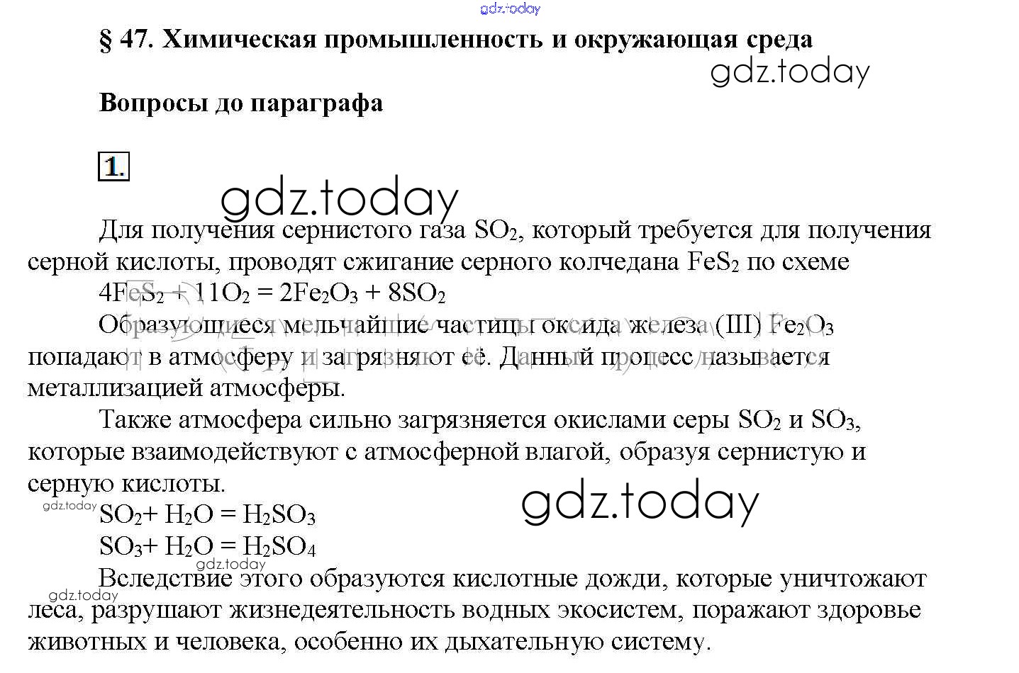 На страницах сайта gdz.today вы найдете учебный и вспомогательный материал, направленный на улучшения знаний школьной программы. ГДЗ - онлайн мир знаний Вопросы до параграфа Решение к § 47. Химическая промышленность и окружающая среда 1 Учебнику по Химии для 11 класса Рудзитис, Фельдман Базовый уровень Просвещение 2017