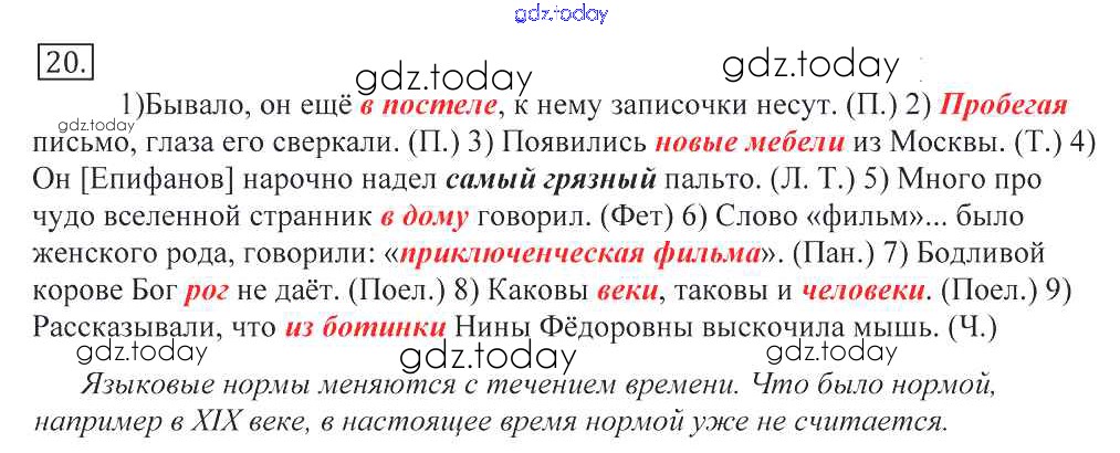 На страницах сайта gdz.today вы найдете учебный и вспомогательный материал, направленный на улучшения знаний школьной программы. ГДЗ - онлайн мир знаний Решение к упражнениям 20 Учебнику по Русскому языку для 10-11 класса Греков, Крючков Просвещение 2016
