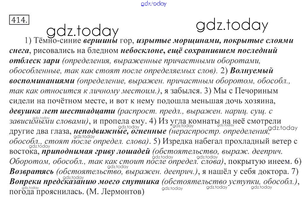 На страницах сайта gdz.today вы найдете учебный и вспомогательный материал, направленный на улучшения знаний школьной программы. ГДЗ - онлайн мир знаний Решение к упражнениям 414 Учебнику по Русскому языку для 10-11 класса Греков, Крючков Просвещение 2016