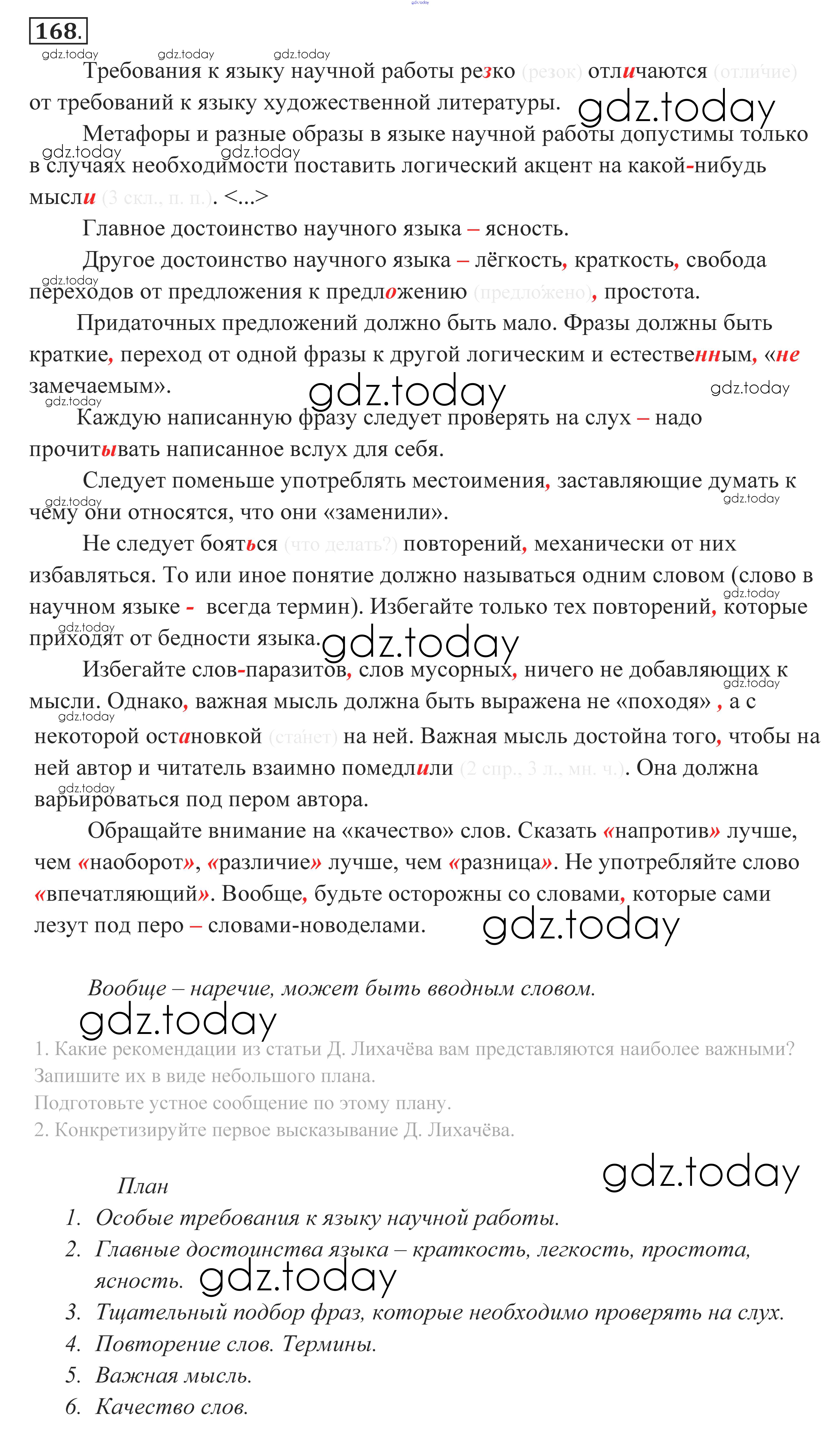 На страницах сайта gdz.today вы найдете учебный и вспомогательный материал, направленный на улучшения знаний школьной программы. ГДЗ - онлайн мир знаний Решение к упражнениям 168 Учебнику по Русскому языку для 10-11 класса Власенков, Рыбченкова Базовый уровень Просвещение 2014