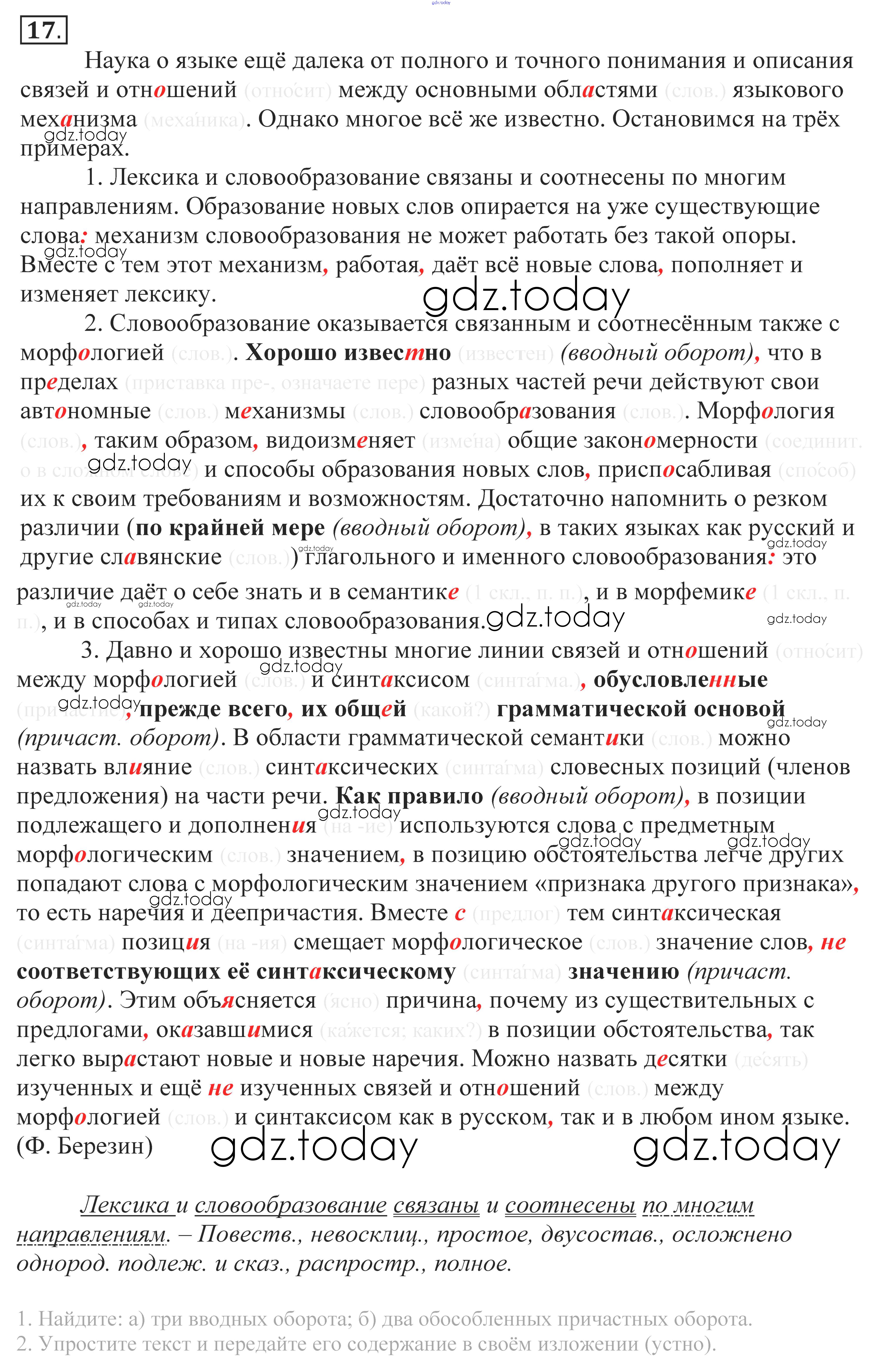 На страницах сайта gdz.today вы найдете учебный и вспомогательный материал, направленный на улучшения знаний школьной программы. ГДЗ - онлайн мир знаний Решение к упражнениям 17 Учебнику по Русскому языку для 10-11 класса Власенков, Рыбченкова Базовый уровень Просвещение 2014