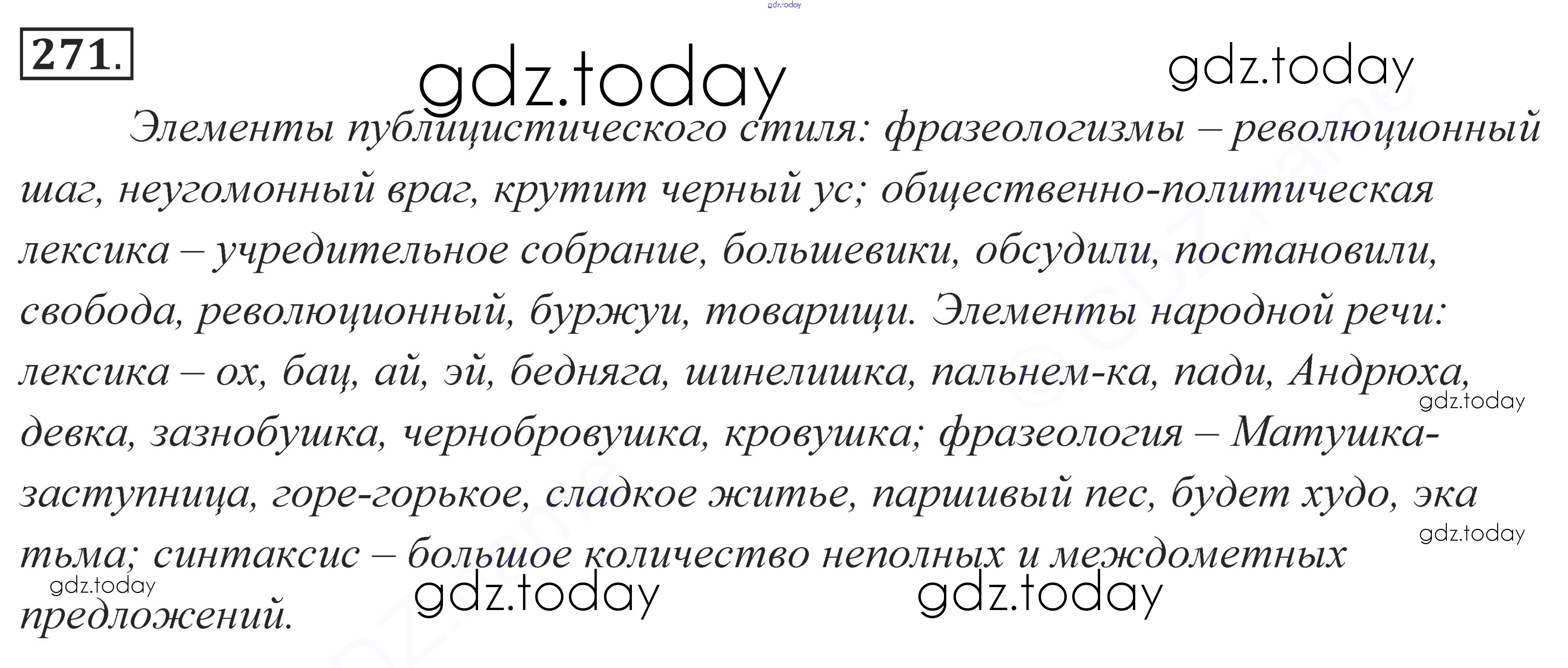 На страницах сайта gdz.today вы найдете учебный и вспомогательный материал, направленный на улучшения знаний школьной программы. ГДЗ - онлайн мир знаний Решение к упражнениям 271 Учебнику по Русскому языку для 10-11 класса Власенков, Рыбченкова Базовый уровень Просвещение 2014