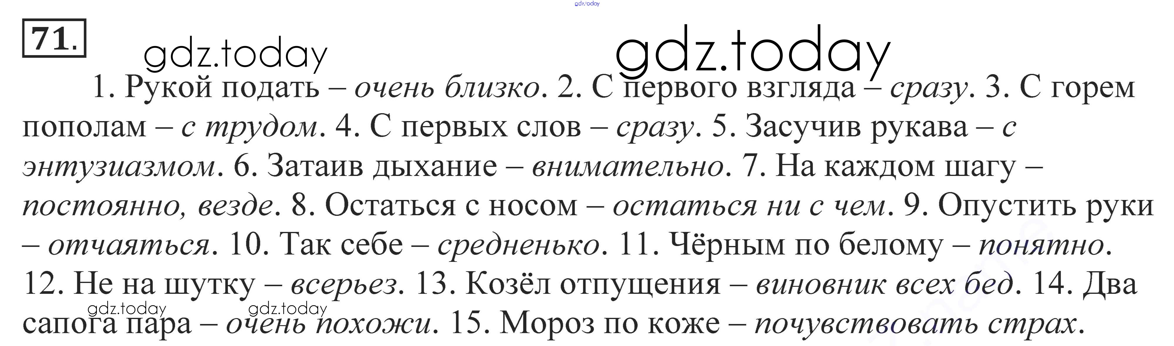 На страницах сайта gdz.today вы найдете учебный и вспомогательный материал, направленный на улучшения знаний школьной программы. ГДЗ - онлайн мир знаний Решение к упражнениям 71 Учебнику по Русскому языку для 10-11 класса Власенков, Рыбченкова Базовый уровень Просвещение 2014