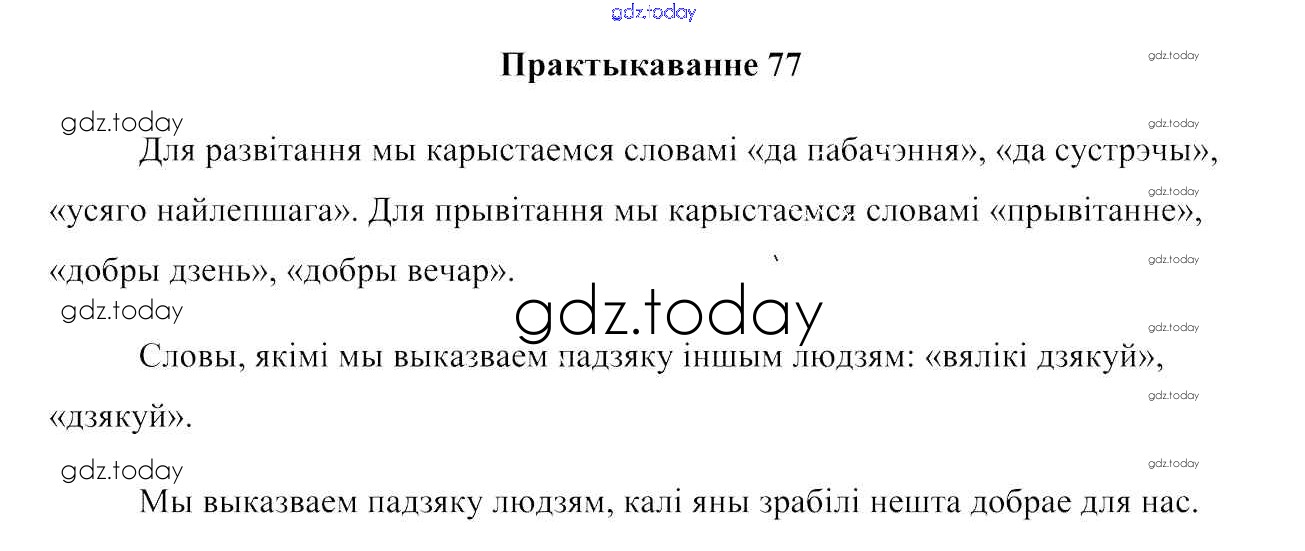 На страницах сайта gdz.today вы найдете учебный и вспомогательный материал, направленный на улучшения знаний школьной программы. ГДЗ - онлайн мир знаний Рашальнік да часткі 1. Практыкаванні 77 Учебнику по Белорусскому языку для 2 класса Свірыдзенка Национальный институт образования 2016