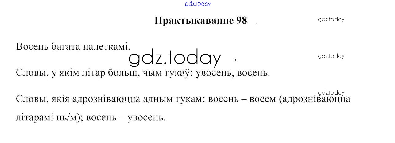 На страницах сайта gdz.today вы найдете учебный и вспомогательный материал, направленный на улучшения знаний школьной программы. ГДЗ - онлайн мир знаний Рашальнік да часткі 1. Практыкаванні 98 Учебнику по Белорусскому языку для 2 класса Свірыдзенка Национальный институт образования 2016