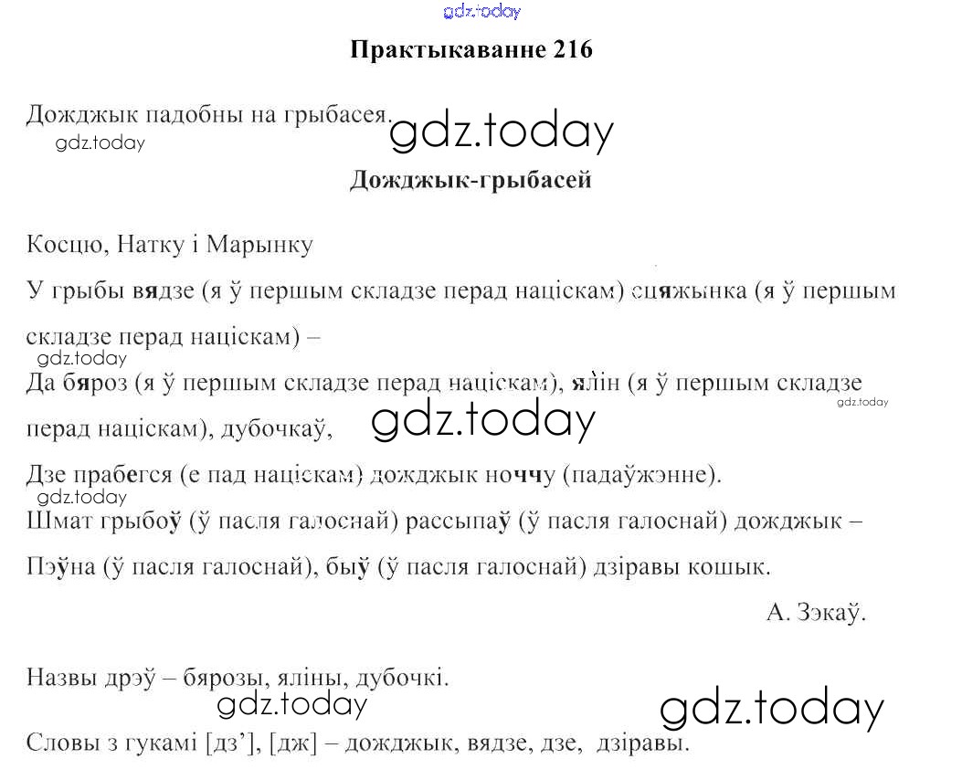 На страницах сайта gdz.today вы найдете учебный и вспомогательный материал, направленный на улучшения знаний школьной программы. ГДЗ - онлайн мир знаний Рашальнік да часткі 2. Практыкаванні 216 Учебнику по Белорусскому языку для 2 класса Свірыдзенка Национальный институт образования 2016