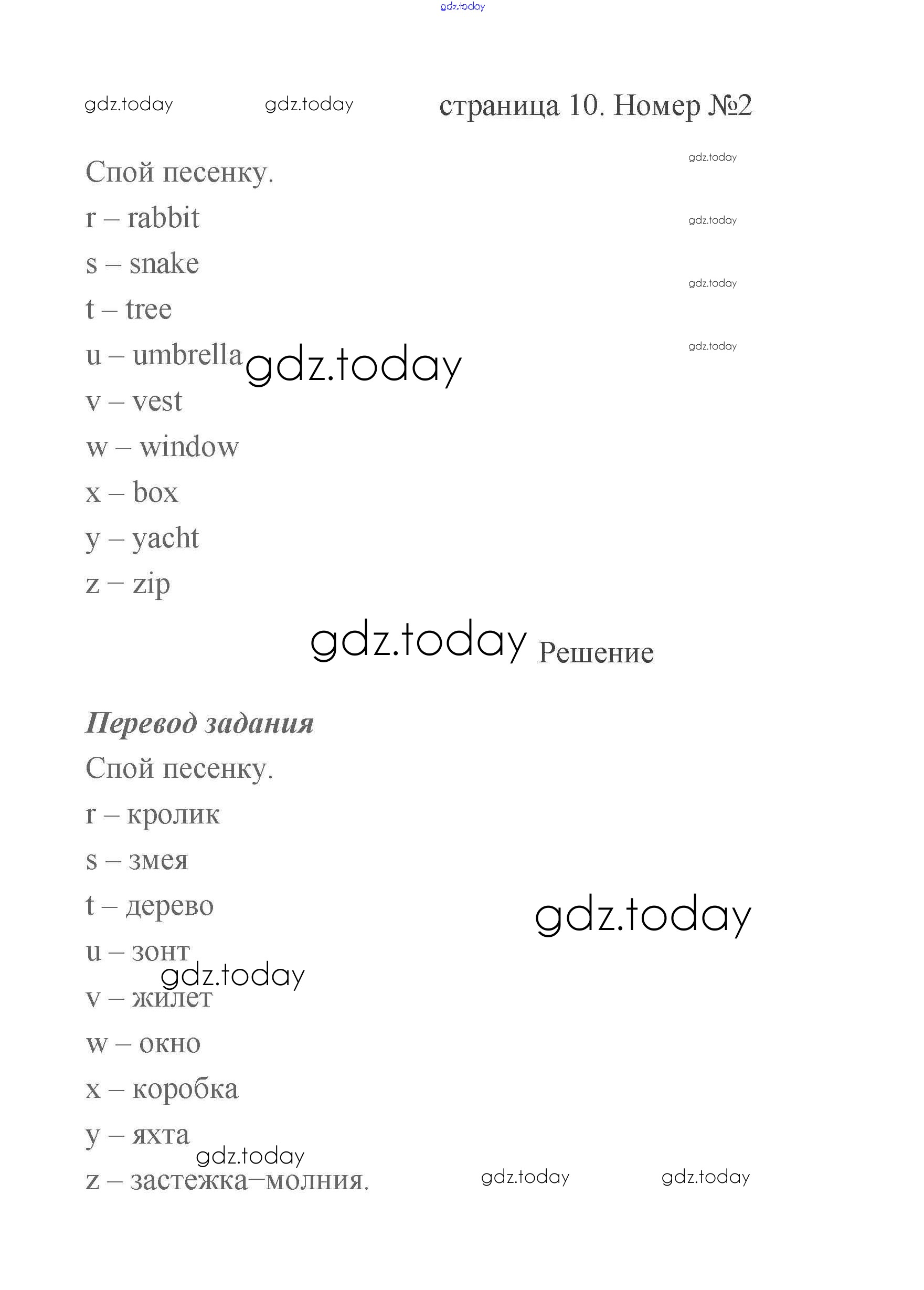 На страницах сайта gdz.today вы найдете учебный и вспомогательный материал, направленный на улучшения знаний школьной программы. ГДЗ - онлайн мир знаний Решение к части 1 (Страницы) 10 Учебнику по Английскому языку для 2 класса Быкова, Дули Просвещение Spotlight 2021