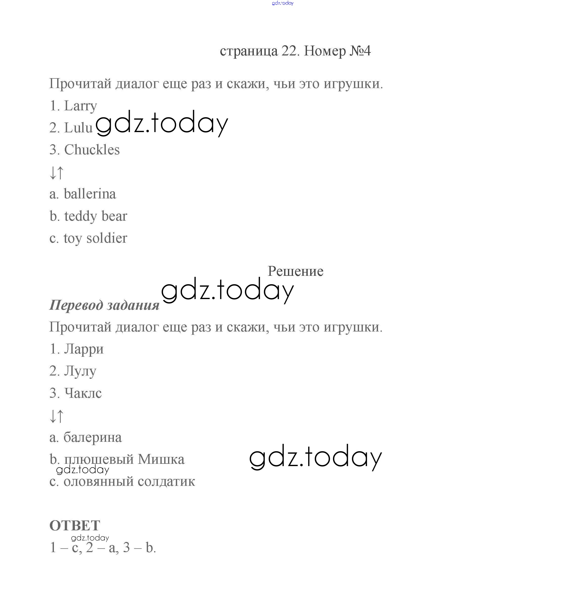На страницах сайта gdz.today вы найдете учебный и вспомогательный материал, направленный на улучшения знаний школьной программы. ГДЗ - онлайн мир знаний Решение к части2 (Страницы) 22 Учебнику по Английскому языку для 2 класса Быкова, Дули Просвещение Spotlight 2021