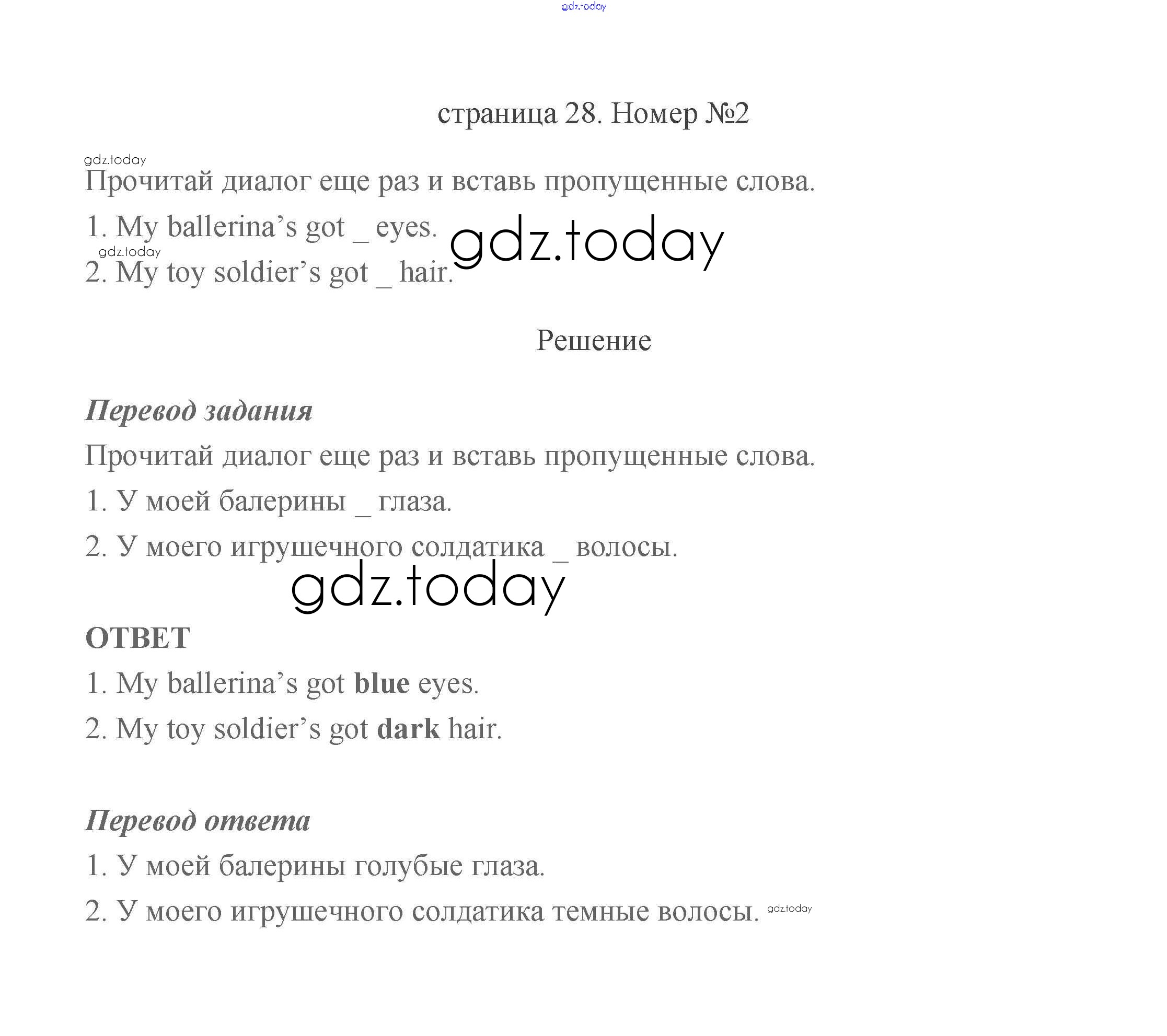 На страницах сайта gdz.today вы найдете учебный и вспомогательный материал, направленный на улучшения знаний школьной программы. ГДЗ - онлайн мир знаний Решение к части2 (Страницы) 28 Учебнику по Английскому языку для 2 класса Быкова, Дули Просвещение Spotlight 2021