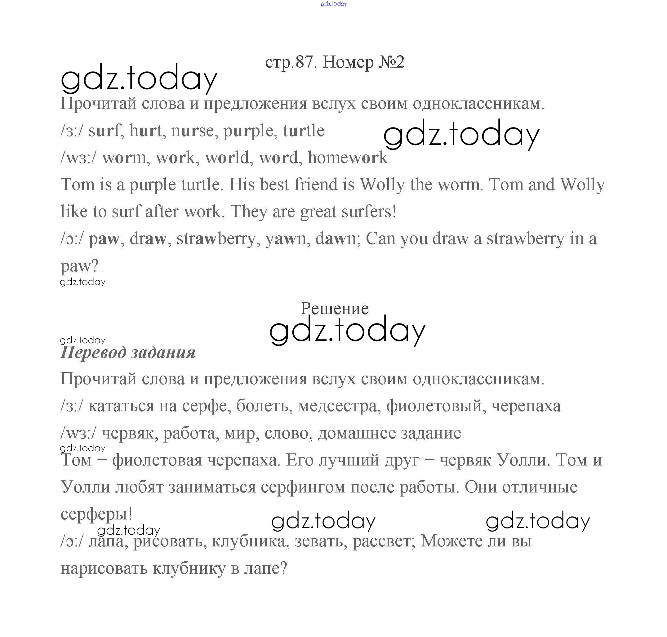 На страницах сайта gdz.today вы найдете учебный и вспомогательный материал, направленный на улучшения знаний школьной программы. ГДЗ - онлайн мир знаний Решение к части 1 (Страницы) 87 Учебнику по Английскому языку для 2 класса Баранова, Эванс Углубленный уровень Просвещение Starlight 2016