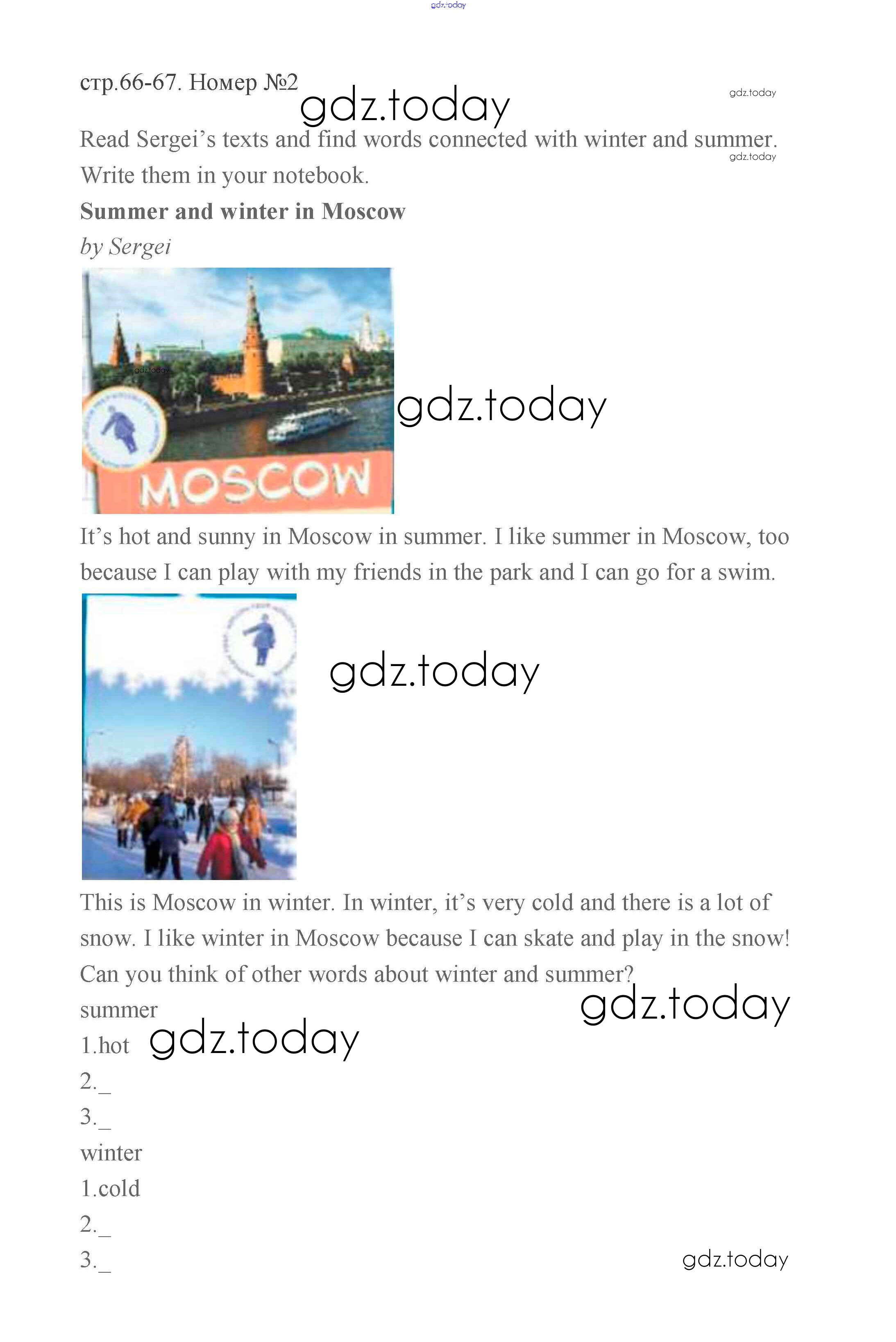На страницах сайта gdz.today вы найдете учебный и вспомогательный материал, направленный на улучшения знаний школьной программы. ГДЗ - онлайн мир знаний Решение к части 2 (Страницы) 66-67 Учебнику по Английскому языку для 2 класса Баранова, Эванс Углубленный уровень Просвещение Starlight 2016