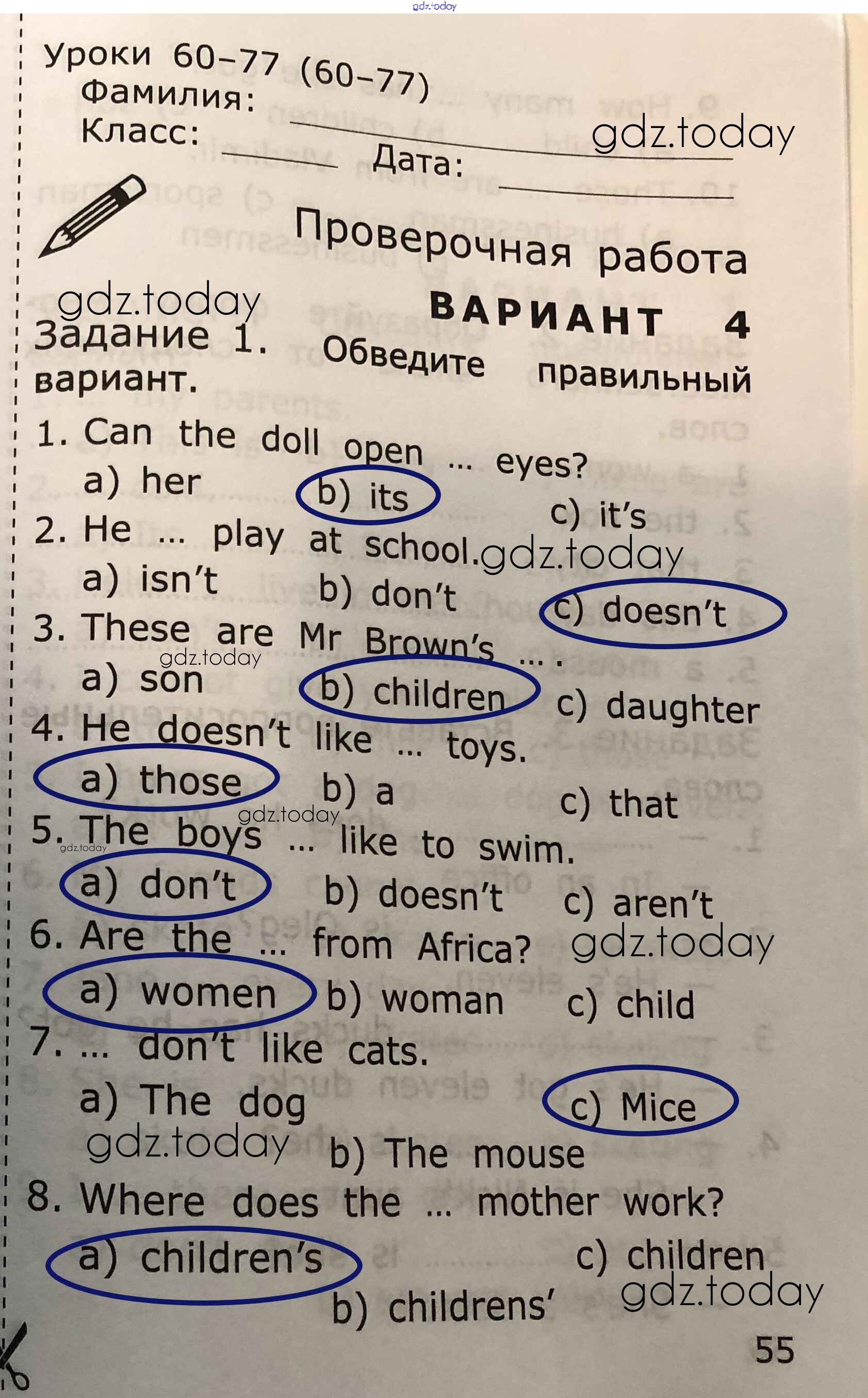На страницах сайта gdz.today вы найдете учебный и вспомогательный материал, направленный на улучшения знаний школьной программы. ГДЗ - онлайн мир знаний Страницы (решение) 55 Проверочным работам по Английскому языку для 2 класса Барашкова Экзамен УМК 2018