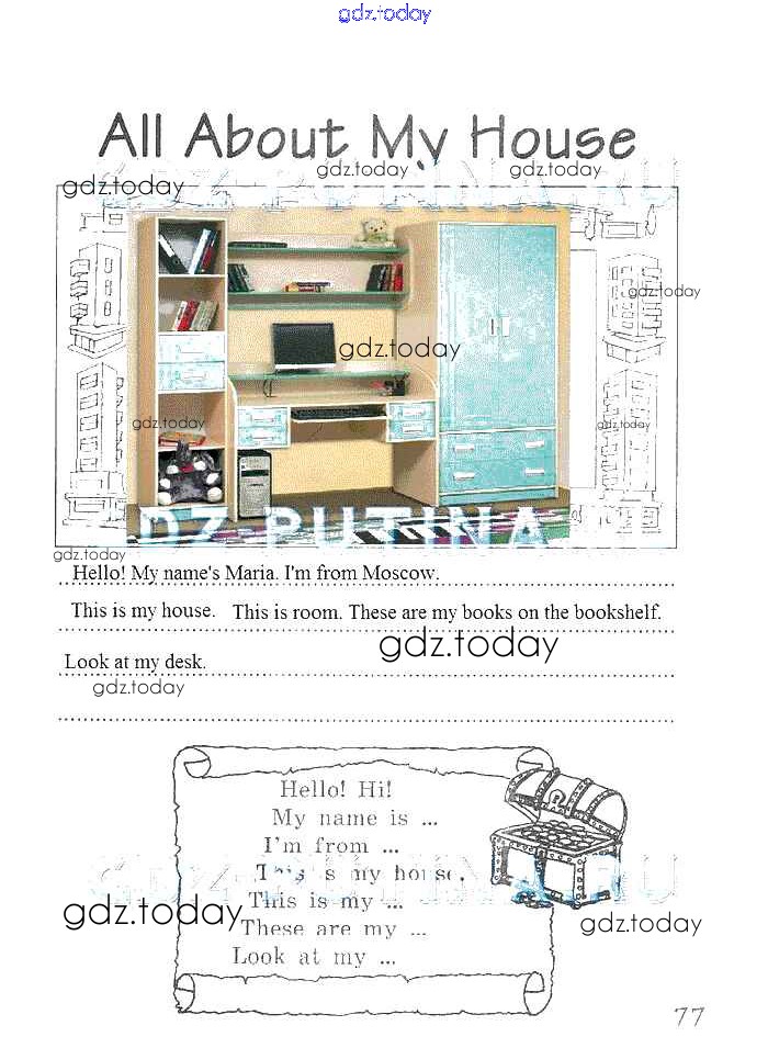 На страницах сайта gdz.today вы найдете учебный и вспомогательный материал, направленный на улучшения знаний школьной программы. ГДЗ - онлайн мир знаний Решение. Страницы 77 Рабочей тетради по Английскому языку для 2 класса Комарова, Ларионова Русское слово Brilliant 2014