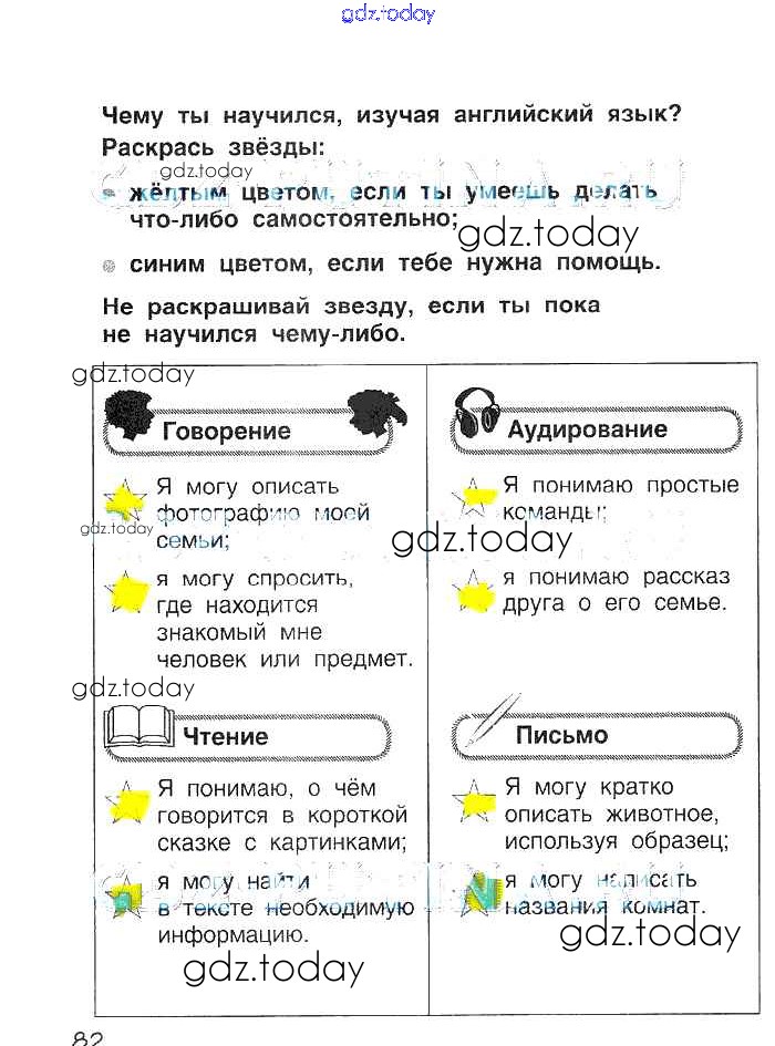 На страницах сайта gdz.today вы найдете учебный и вспомогательный материал, направленный на улучшения знаний школьной программы. ГДЗ - онлайн мир знаний Решение. Страницы 82 Рабочей тетради по Английскому языку для 2 класса Комарова, Ларионова Русское слово Brilliant 2014