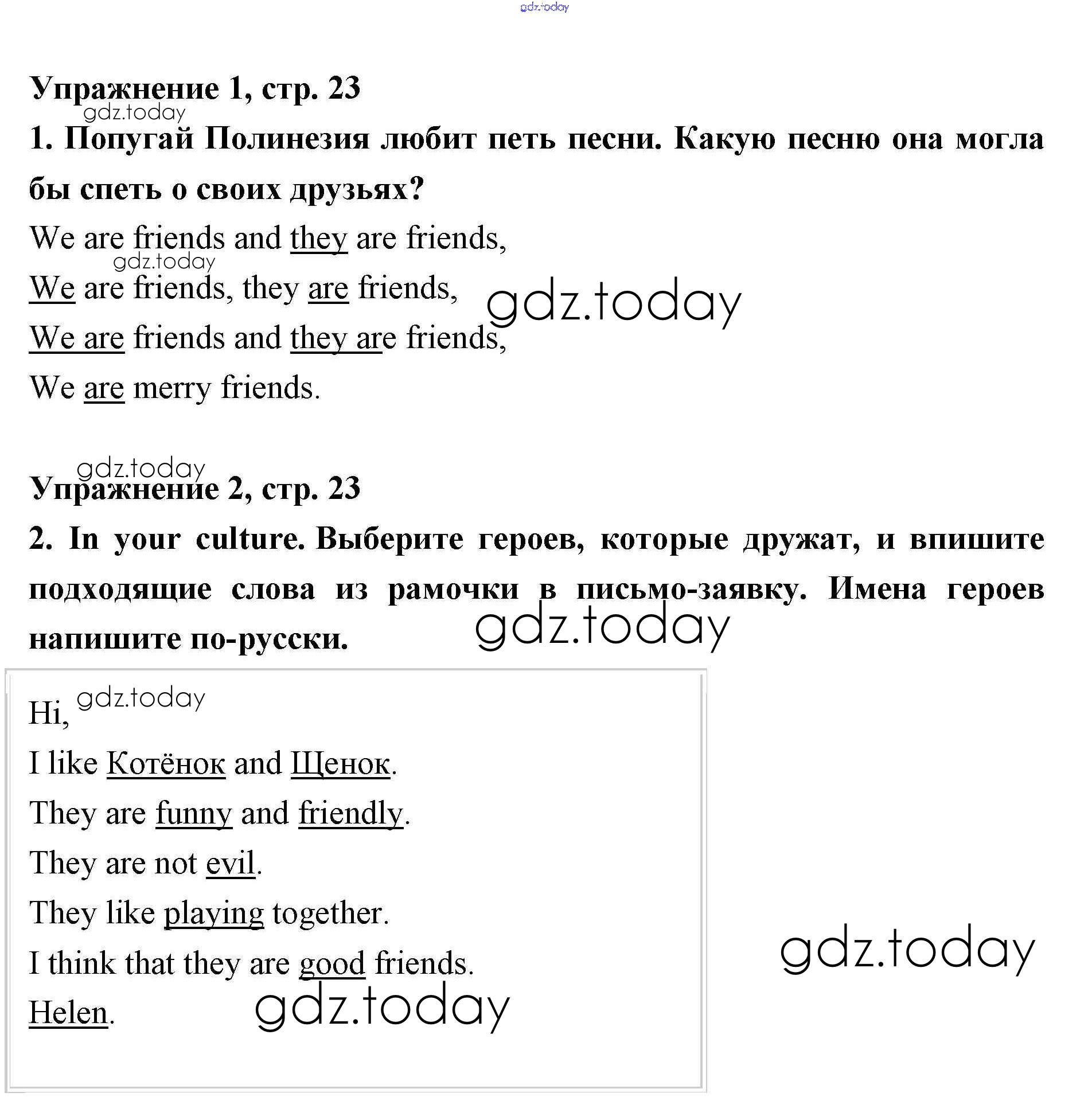 На страницах сайта gdz.today вы найдете учебный и вспомогательный материал, направленный на улучшения знаний школьной программы. ГДЗ - онлайн мир знаний Решение. Lesson 13. We are friends 23 Рабочей тетради по Английскому языку для 2 класса Кузовлев, Перегудова Просвещение 2011