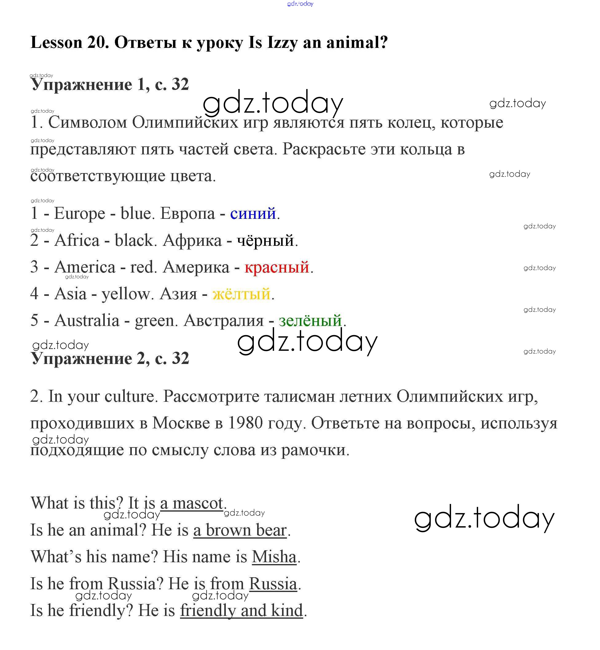 На страницах сайта gdz.today вы найдете учебный и вспомогательный материал, направленный на улучшения знаний школьной программы. ГДЗ - онлайн мир знаний Решение. Lesson 20. Is Izzy an animal 32 Рабочей тетради по Английскому языку для 2 класса Кузовлев, Перегудова Просвещение 2011