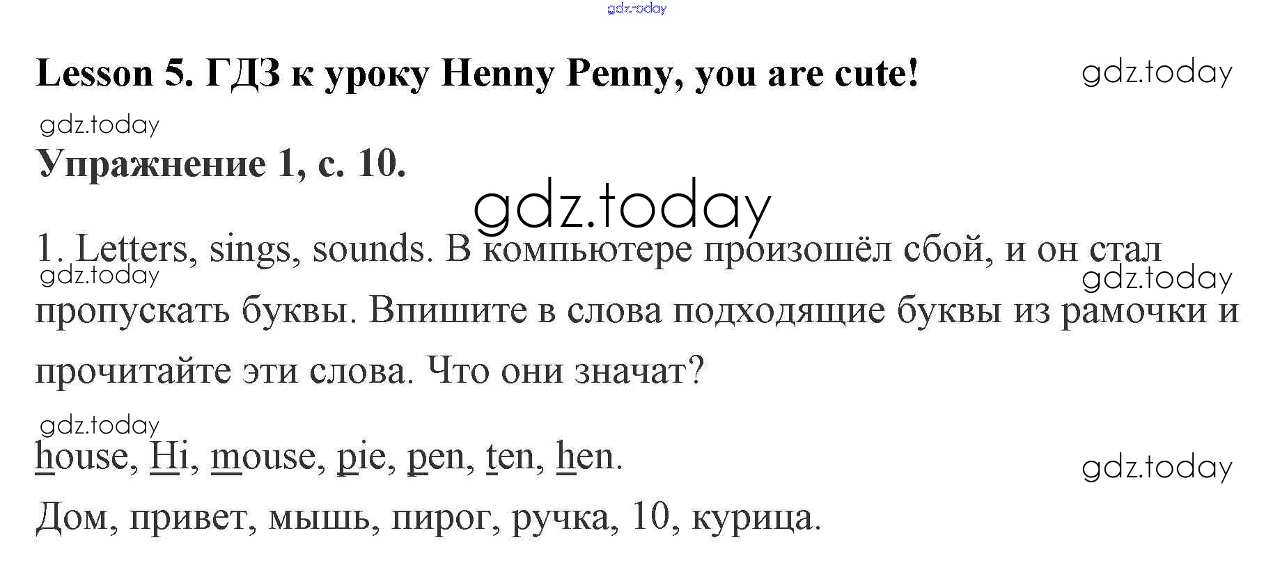 На страницах сайта gdz.today вы найдете учебный и вспомогательный материал, направленный на улучшения знаний школьной программы. ГДЗ - онлайн мир знаний Решение. Lesson 5. Henny Penny, you are cute! 10 Рабочей тетради по Английскому языку для 2 класса Кузовлев, Перегудова Просвещение 2011