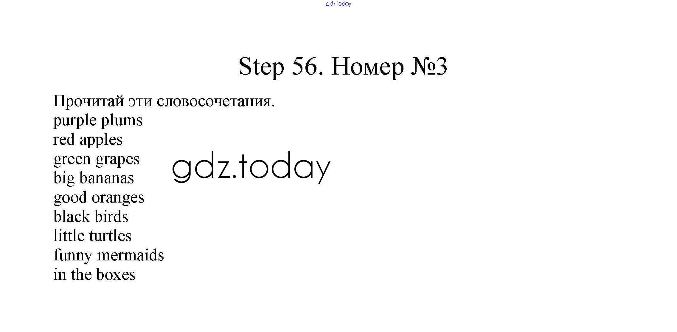 На страницах сайта gdz.today вы найдете учебный и вспомогательный материал, направленный на улучшения знаний школьной программы. ГДЗ - онлайн мир знаний Step 56 Решение. Часть 2 3 Учебнику по Английскому языку для 2 класса Афанасьева, Михеева Дрофа Rainbow 2017