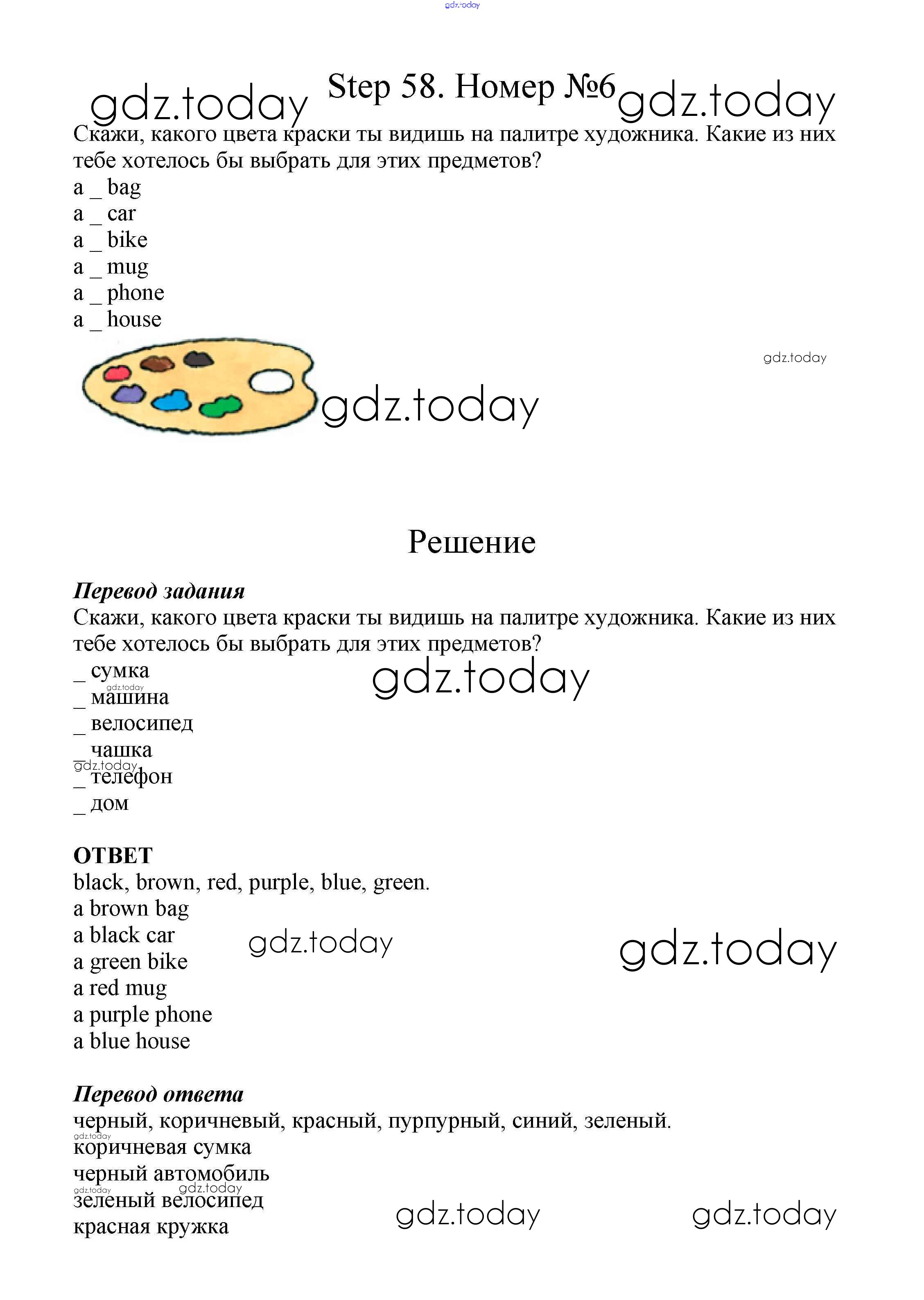 На страницах сайта gdz.today вы найдете учебный и вспомогательный материал, направленный на улучшения знаний школьной программы. ГДЗ - онлайн мир знаний Step 58 Решение. Часть 2 6 Учебнику по Английскому языку для 2 класса Афанасьева, Михеева Дрофа Rainbow 2017