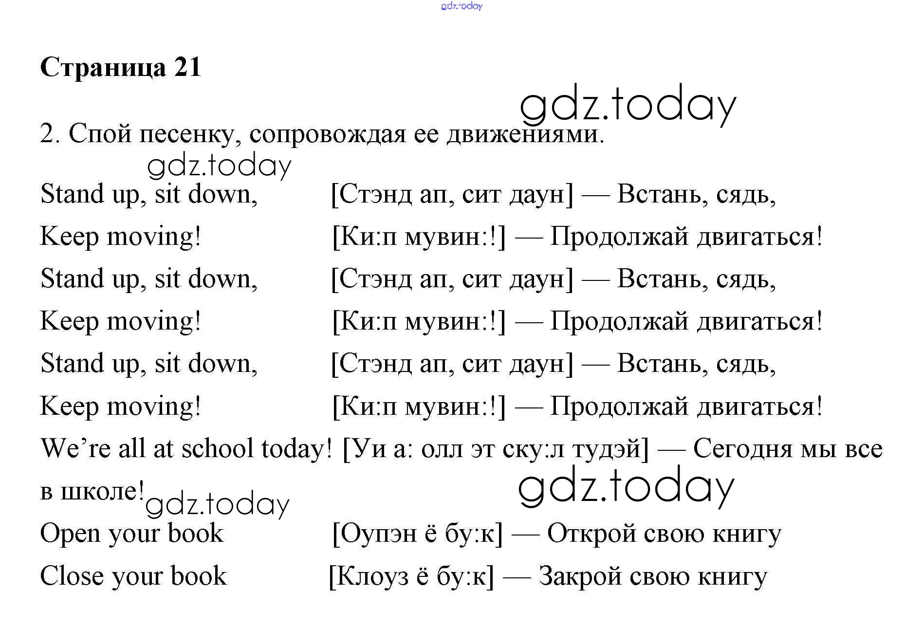 На страницах сайта gdz.today вы найдете учебный и вспомогательный материал, направленный на улучшения знаний школьной программы. ГДЗ - онлайн мир знаний Решение. Учебник 2017. Страницы 21 Учебнику по Английскому языку для 2 класса Быкова, Дули Просвещение, Просвещение Spotlight 2017, 2021