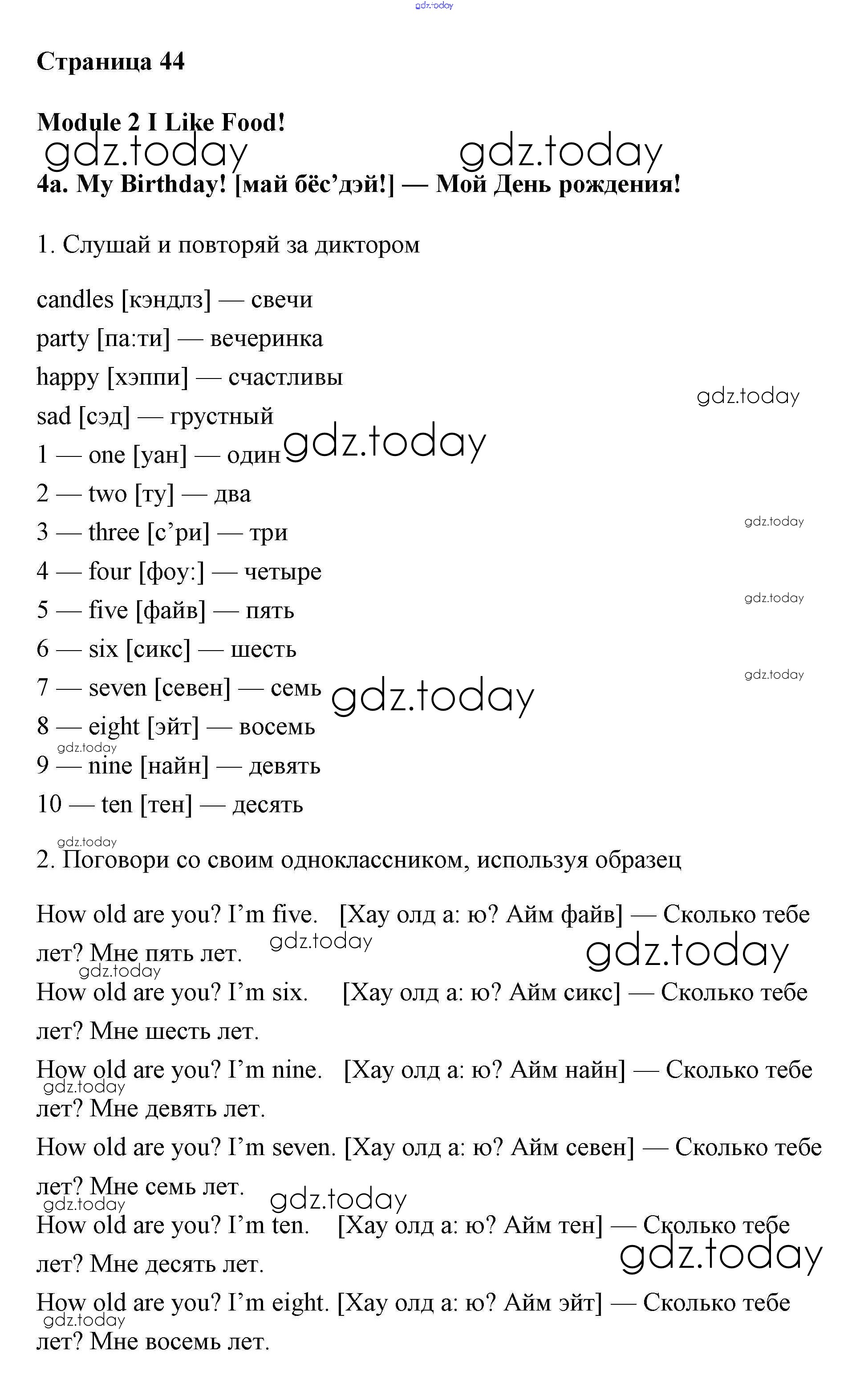 На страницах сайта gdz.today вы найдете учебный и вспомогательный материал, направленный на улучшения знаний школьной программы. ГДЗ - онлайн мир знаний Решение. Учебник 2017. Страницы 44 Учебнику по Английскому языку для 2 класса Быкова, Дули Просвещение, Просвещение Spotlight 2017, 2021