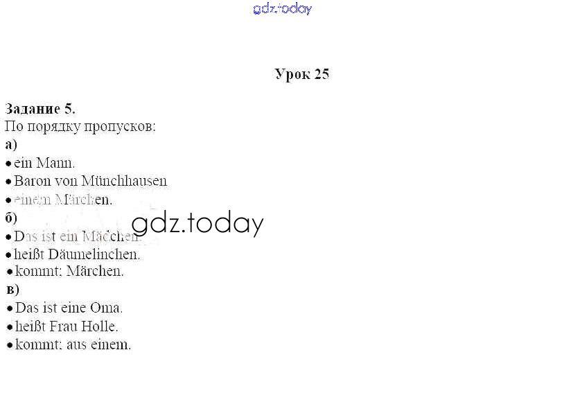 На страницах сайта gdz.today вы найдете учебный и вспомогательный материал, направленный на улучшения знаний школьной программы. ГДЗ - онлайн мир знаний Урок 25 Решение к части 1 5 Учебнику по Немецкому языку для 2 класса Бим, Рыжова Просвещение 2014